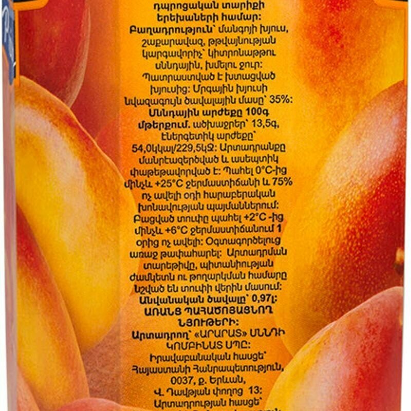 | Состав | Пюре из манго, сахар-песок, регулятор кислотности - кислота лимонная пищевая, вода питьевая |