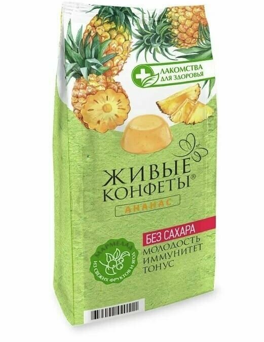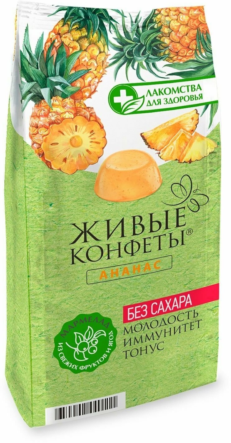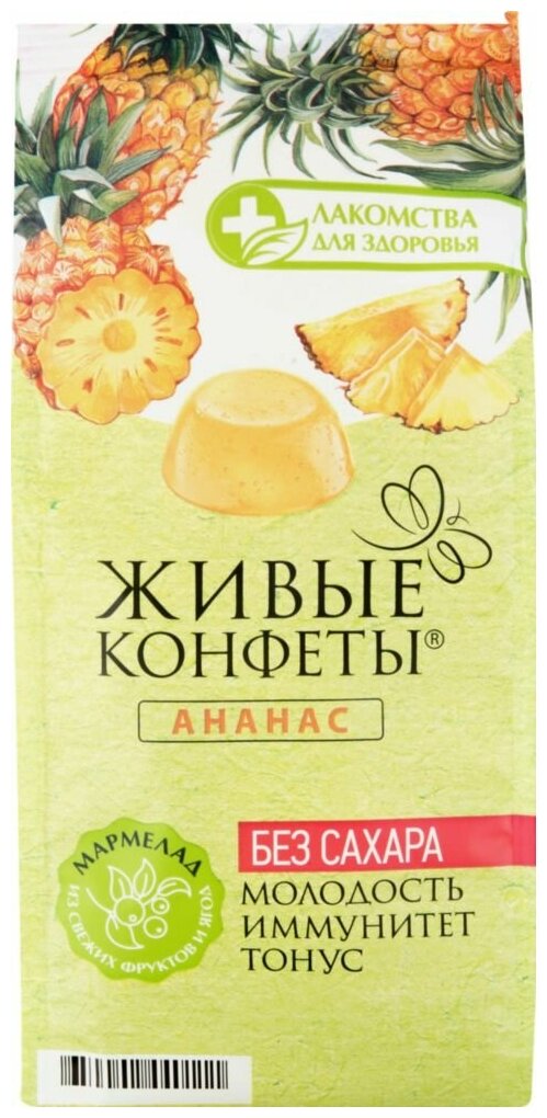 Мармелад желейный Лакомство для здоровья Ананас 170г - это натуральные полезные сладости для стройности, созданные на основе фруктов, ягод и растений, известных своими целебными свойствами. Ананасовый мармелад приготовлен из настоящих ананасов. В них содержатся особые ферменты, способствующие расщеплению жировых отложений. В качестве подсластителя в конфетки добавлена фруктоза, обеспечивающая равномерное поступление глюкозы в кровь. Агар (вытяжка из морских водорослей) играет роль желирующего агента; он имеет растительное происхождение и нулевую калорийность. Мармелад не содержит искусственных добавок и сахара. Каждая конфетка находится в индивидуальной упаковке. Подходит для вегетарианского, постного и диетического питания.