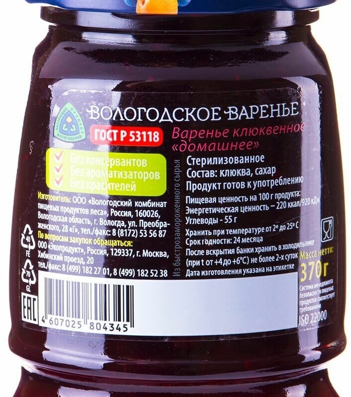 Варенье Вологодское Домашнее Клюквенное 370г - это 100% натуральный продукт, приготовленный по ГОСТу из отборной спелой клюквы и сахара без добавления искусственных ароматизаторов, красителей и консервантов. По вкусу и консистенции оно напоминает настоящее домашнее варенье: ароматное, густое, с большим количеством цельных ягод и умеренным содержанием сахара. Подайте его в специальных розеточках к чаепитию, предложите к сырникам, творогу, блинам и оладьям. Используйте как соус к мясу на гриле или сырной тарелке. Упаковано в фирменную стеклянную банку оригинальной формы.