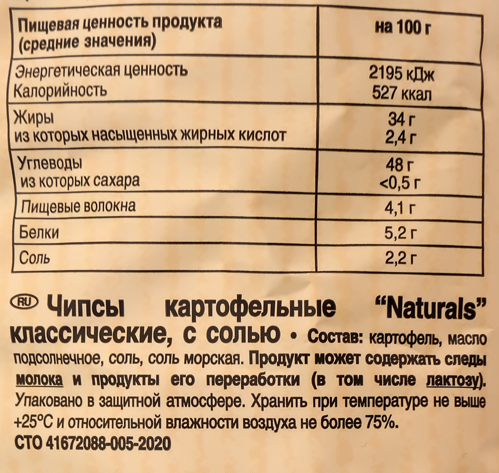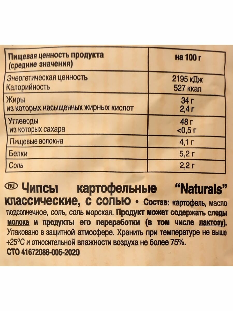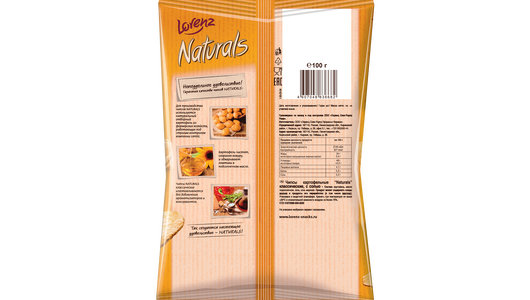 Описание товара:Для производства чипсов Naturals используются только натуральный картофель. Приправляются тщательно подобранными натуральными специями, которые не содержат консервантов, искусственных ароматизаторов и красителей. Гарантия качества чипсов NATURALS: 1. Для производства чипсов NATURALS используется только отборный картофель, выращенный в специализированных фермерских хозяйствах Германии, работающих под строгим контролем компании Lorenz на постоянной основе. 2. Картофель чистят, сохраняя кожуру, и слегка обжаривают ломтики в подсолнечном масле высшего качества. 3. Чипсы NATURALS приправлены тщательно подобранными натуральными специями, которые не содержат консервантов, искусственных ароматизаторов и красителей. Так создается настоящее удовольствие - NATURALS!Состав товара:Картофель, масло подсолнечное, соль поваренная пищевая, соль пищевая морская, сухая молочная сыворотка подсырная, сахар, ароматизатор натуральный, порошок паприки, томатный порошок, луковый порошок, фруктоза, специи и пряные травы (порошок кориандра, порошок имбиря, порошок перца, порошок перца белого сорт манток).Меры предосторожности:Хранить в сухом и прохладном месте.
