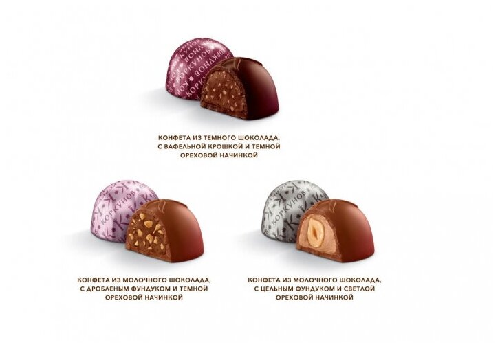 Состав: Молочный шоколад (сахар, сухое цельное молоко, какао масло, какао тертое, молочный жир, эмульгаторы (соевый лецитин, е492), ароматизатор (ванилин)); начинки (сахар, фундук, жир специального назначения (масло пальмовое, масло пальмоядровое, эмульгатор (подсолнечный лецитин)), сухое цельное молоко, глюкоза, дробленая вафля (сахар, мука пшеничная, растительное масло (рапсовое, подсолнечное), молочный жир, лактоза, молочный белок, ячменный солодовый экстракт, соль, разрыхлитель (гидрокарбонат натрия), эмульгатор (подсолнечный лецитин), антиокислитель (концентрат смеси токоферолов)), молочный жир, какао порошок, эмульгатор (соевый лецитин), ароматизаторы (ванилин, лесной орех)). шоколадные конфеты ассорти содержат глютен. могут содержать незначительное количество яичного белка, миндаля.