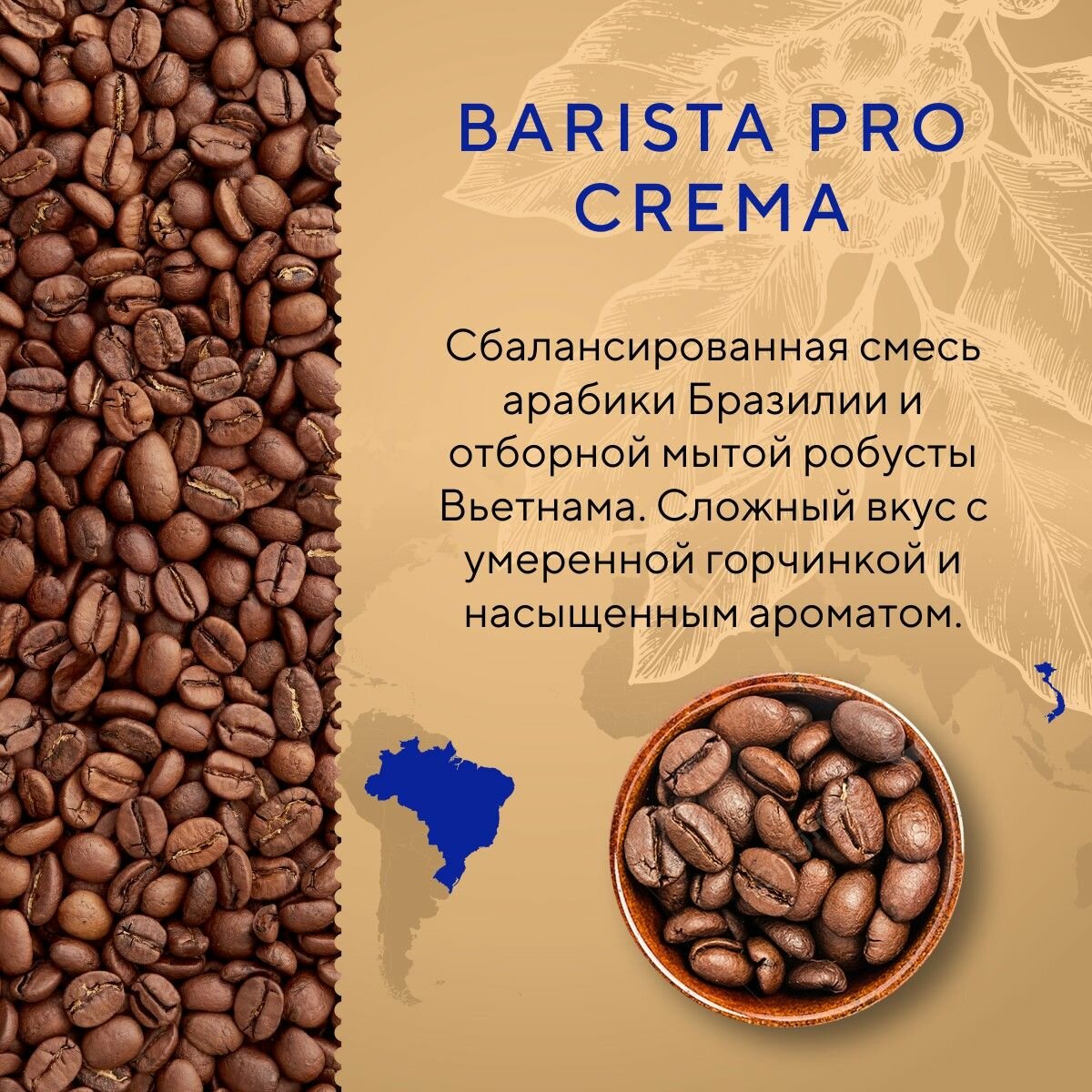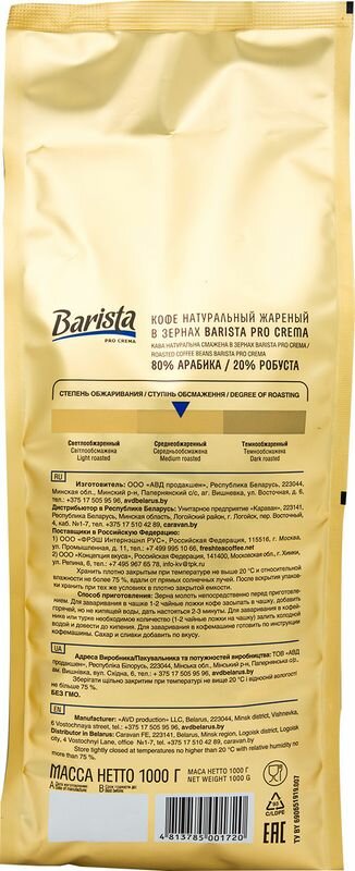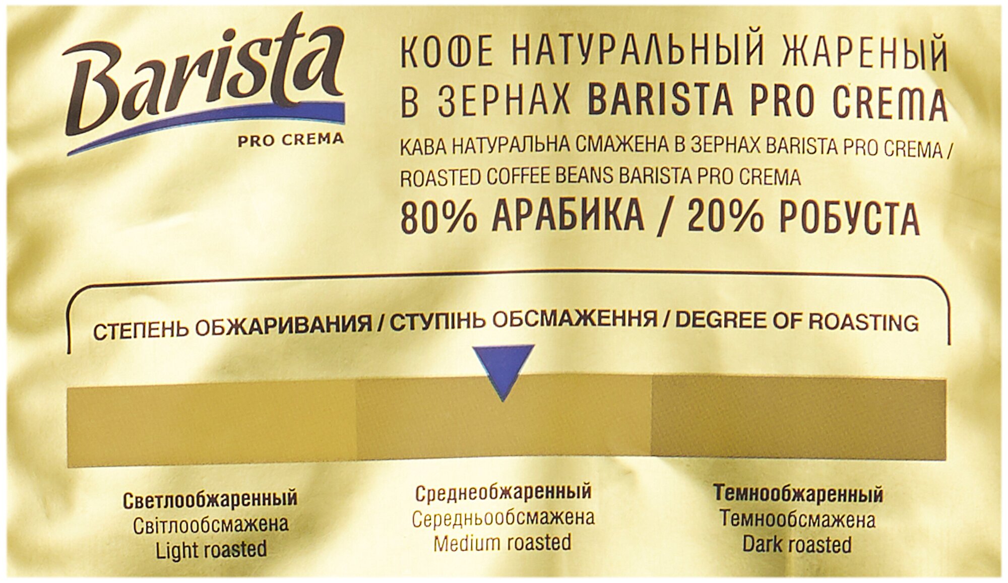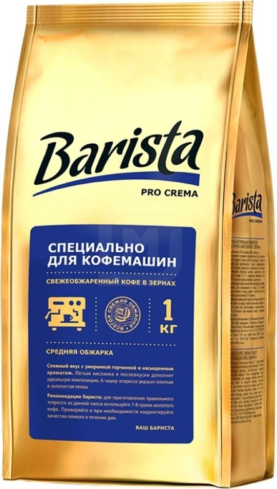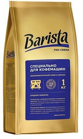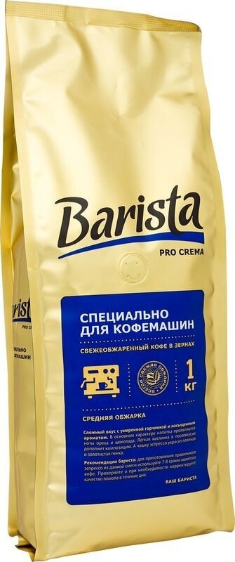 Кофе в зернах Barista Pro Crema 1кг - это свежеобжаренная смесь двух известных сортов кофе (Арабика (80%) и Робуста (20%)), созданная специально для кофемашин. Приготовленный кофейный напиток отличается сложным, но гармоничным вкусом, с преобладающими ореховыми и шоколадными нотками, а также легкой кислинкой в послевкусии. При приготовлении классического эспрессо образуется плотная золотистая пенка. Для приготовления напитка в чашке, турке или другим способом (не в кофемашине) рекомендуется молоть зерна непосредственно перед варкой и использовать 1-2 ч.л. на 1 чашку. После вскрытия упаковки зерна следует переложить в герметичную емкость.