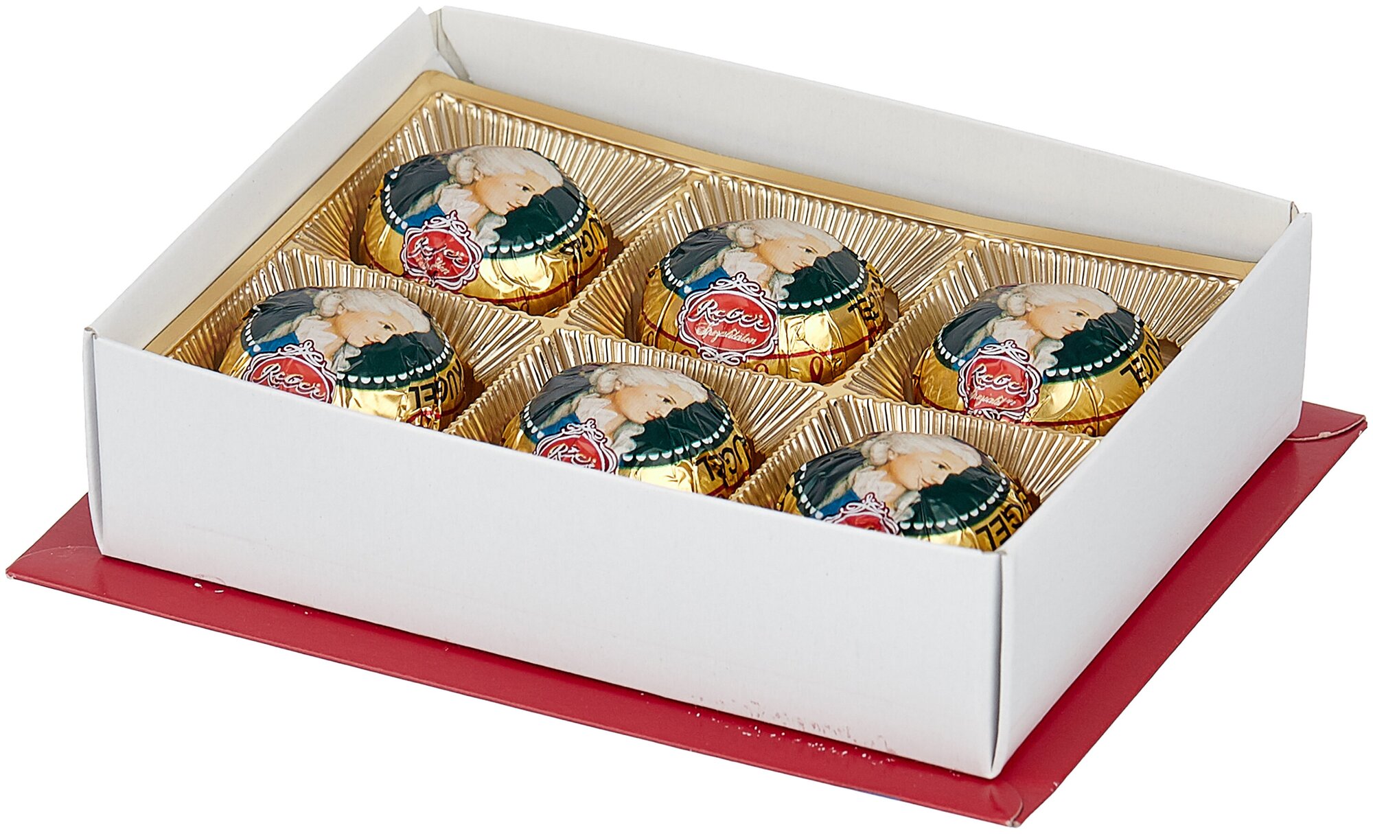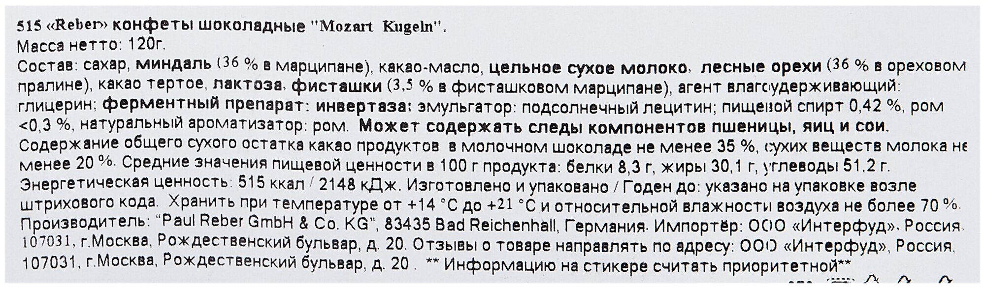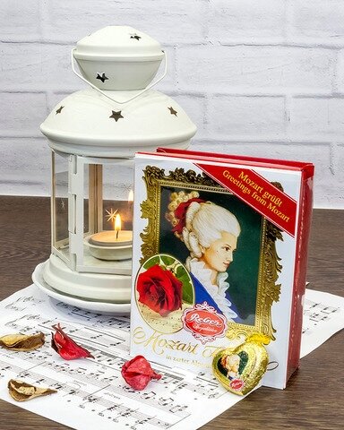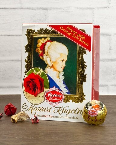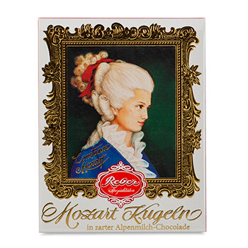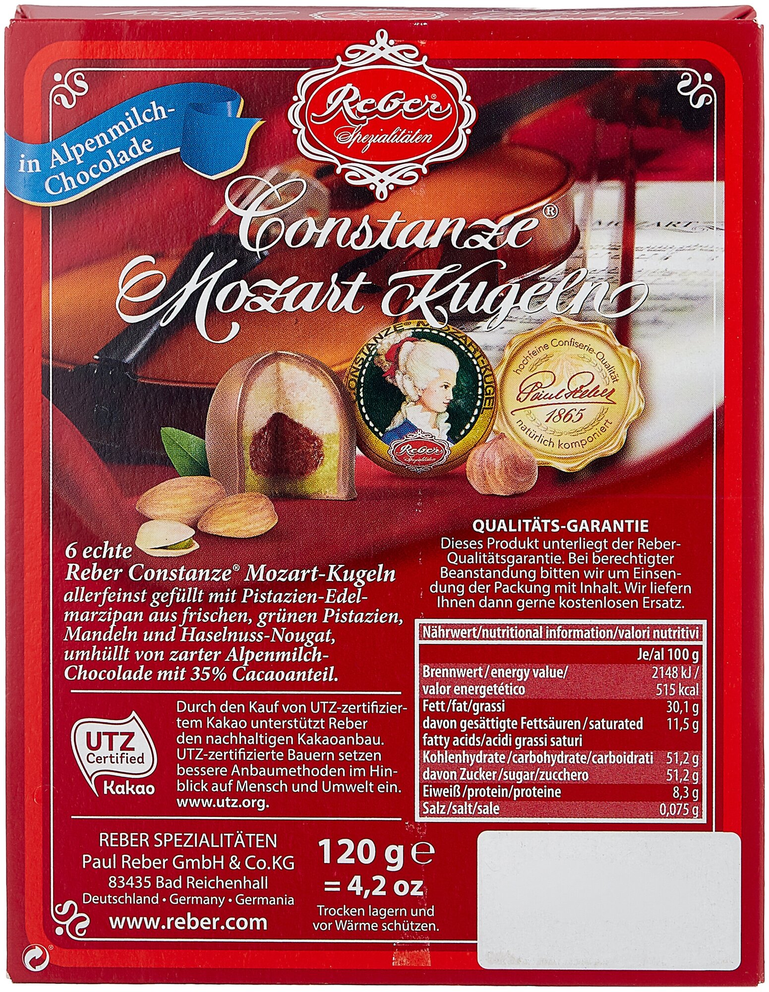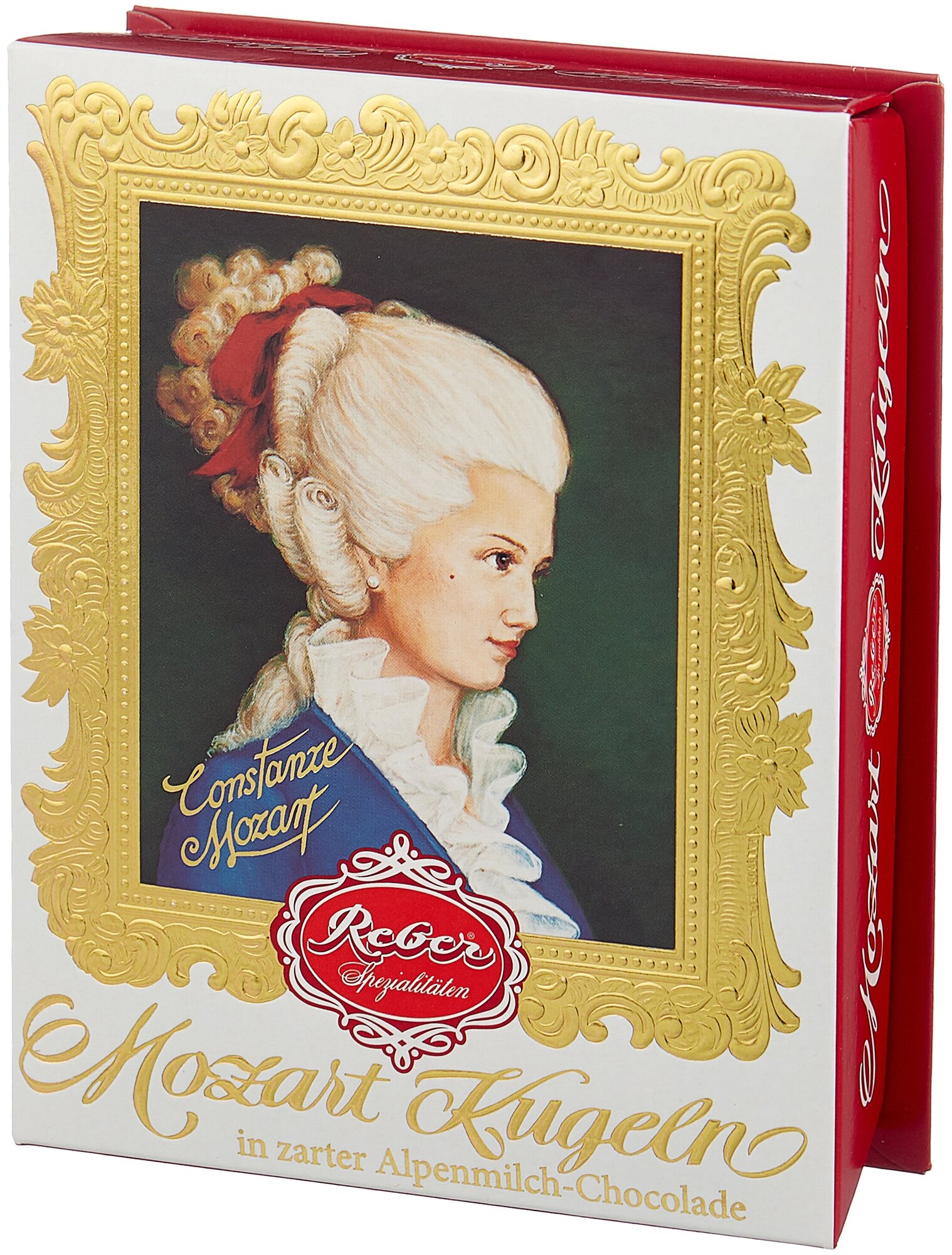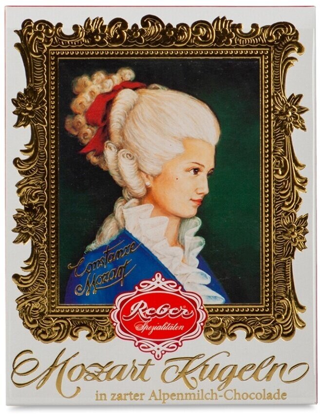 Конфеты Reber Mozart Kugeln 120г - это легендарные шоколадные шарики с оригинальной начинкой Constanze. Внутри корпуса из альпийского молочного шоколада находится двухслойный марципан из зеленых фисташек и миндаля с фундучной нугой в сердцевине. Традиционные круглые конфеты были созданы австрийским кондитером Паулем Фюрстом в честь великого композитора Вольфганга Амадея Моцарта и членов его семьи. Всего в коробке - 6 штук. Упакованы в фирменную коробку с изображением Марии Констанции Моцарт (жены композитора).