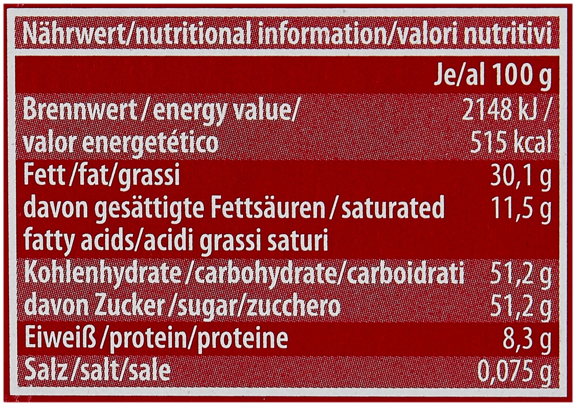| Состав | Сахар, миндаль (36% в марципане), какао-масло, цельное сухое молоко, лесной орех (38% в ореховом пралине), какао масса, лактоза, фисташки (3,5% в фисташковом марципане), инвертаза, эмульгатор |