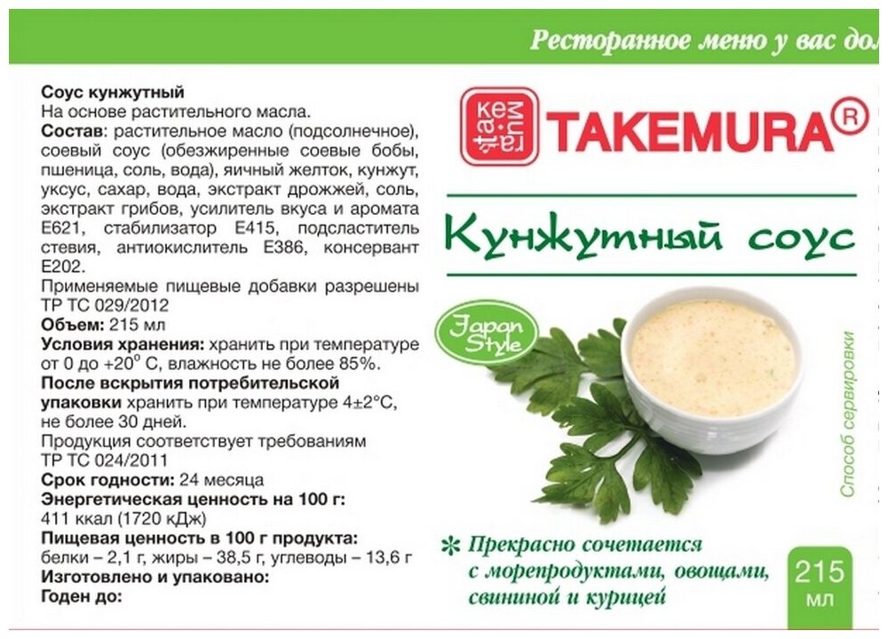 Способ применения: Соус Кунжутный Takemura можно использовать в блюдах европейской кухни в качестве дрессиинга (заправки) для салатов из курицы, с тигровыми креветками, с водорослями и как соус для жареного мяса.