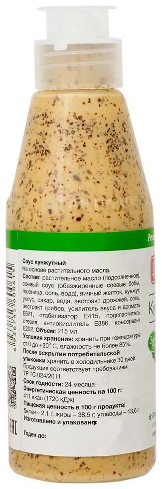 | Состав | Растительное масло (подсолнечное), соевый соус (обезжиренные соевые бобы, пшеница, соль, вода), яичный желток, кунжут, уксус, сахар, вода, экстракт дрожжей, соль, экстракт грибов, усилитель вкуса и аромата E621, стабилизатор E415, подсластитель стевия, антиокислитель E386, консервант E202 |