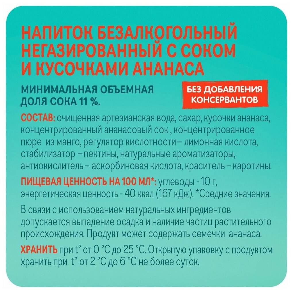 | Состав | Очищенная артезианская вода, сахар, кусочки ананаса, концентрированный ананасовый сок, концентрированное пюре из манго, регулятор кислотности – лимонная кислота, стабилизатор – пектины, натуральный ароматизатор, антиокислитель – аскорбиновая кислота, подсластитель - сукралоза, краситель - каротины |