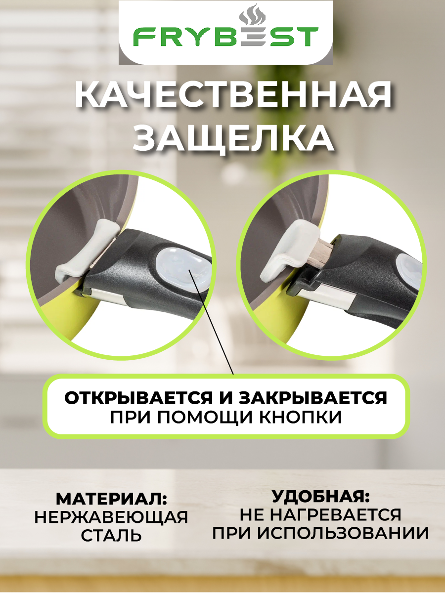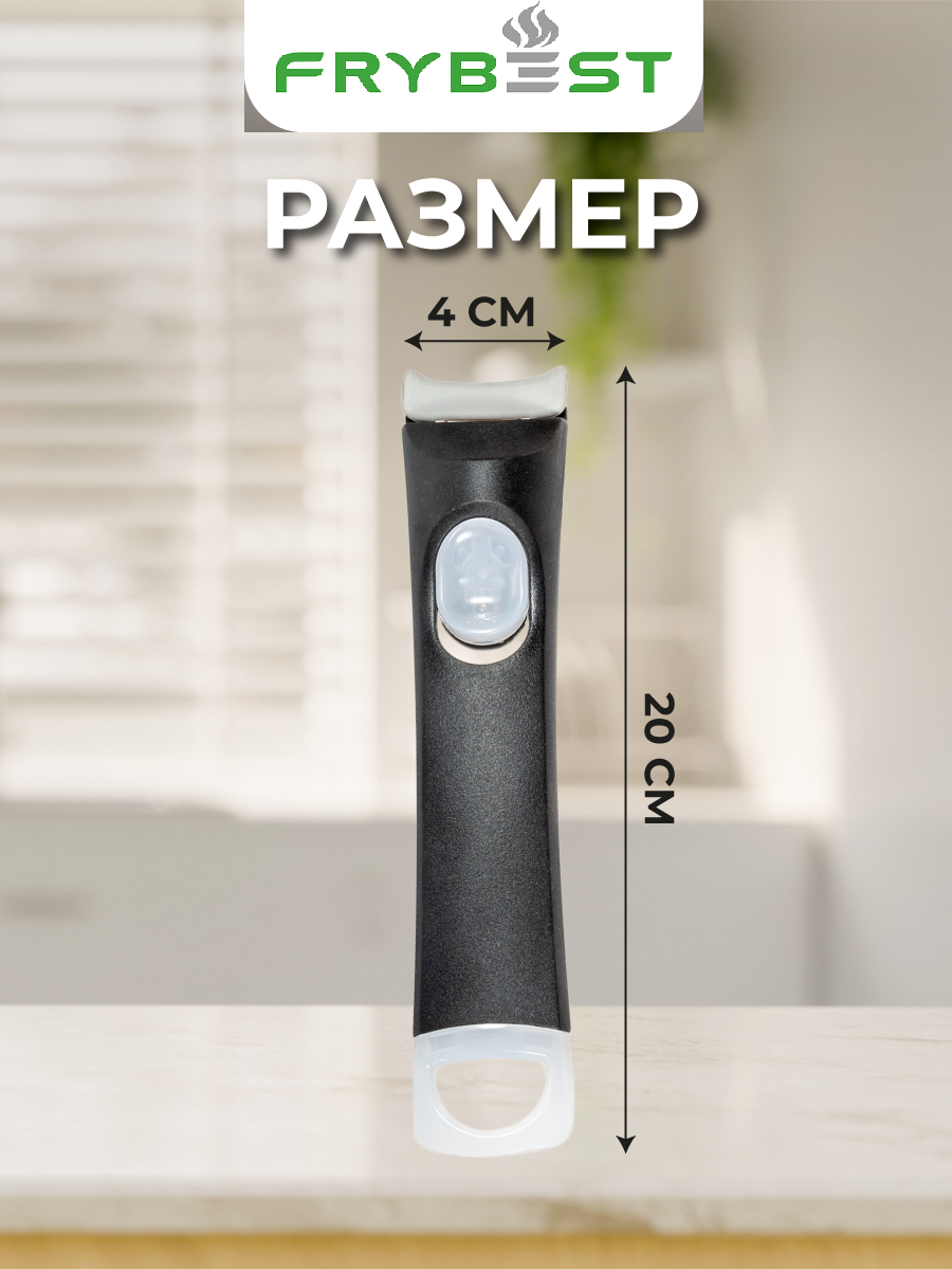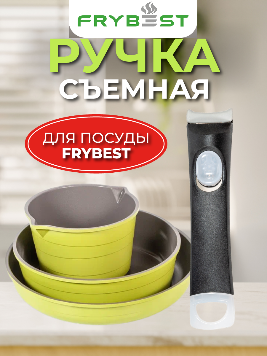 Съемная ручка для посуды Frybest (Фрайбест)- это надежное, прочное и практичное решение для посуды, которое позволит с максимальным комфортом готовить на кухне. Сьемная ручка для сковородки выполнена из экологически чистых, термостойких материалов, и оснащена специальным креплением, которое подходит для наборов Frybest различных коллекций, таких как, Oliva и Splend. Плотный паз и качественная защелка, открывающаяся при помощи кнопки, расположенной на корпусе, позволят быстро и аккуратно переставлять ручку в процессе готовки на различные предметы набора для посуды с керамическим покрытием. Ручка не царапает посуду. С приобретением этой прекрасной ручки для посуды фирмы Frybest у Вас откроются новые возможности, желание удивлять и радовать своих близких различными кулинарными шедеврами! Готовьте в удовольствие с Frybest!