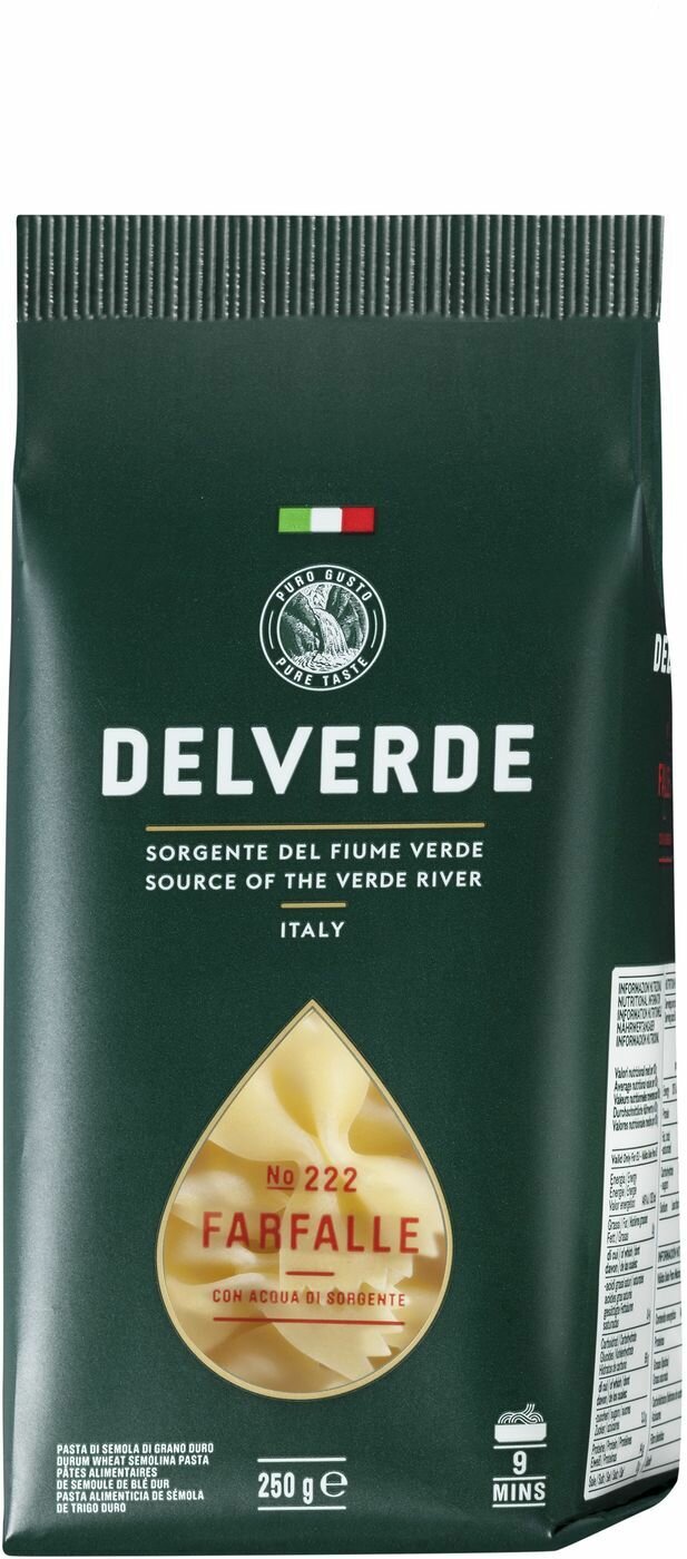 Макароны Delverde Farfalle №222 500г приготовлены из лучших зерен твердых сортов пшеницы и кристально чистой воды. Холодная от природы, родниковая вода из национального парка Майелла в итальянском регионе Абруццо помогает сохранить уникальный вкус пшеницы. Благодаря старинному способу приготовления пасты с помощью бронзовой пресс-формы поверхность макаронных изделий получается шершавой, и за счет этого они лучше удерживают соус. Сушка при низких температурах сохраняет полезные свойства пшеничного зерна. Чтобы получить идеальный вкус al dente, фарфалле (бантики) рекомендуется варить 10-11 минут. Производитель предлагает готовить этот вид пасты с молодыми кабачками и соусом Песто.