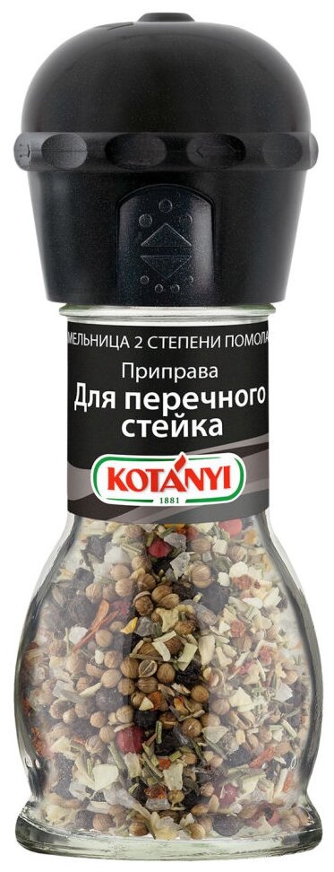 Приправа Kotanyi для перечного стейка 45г - это смесь крупной морской йодированной соли и пряных специй, которые отлично дополняют и подчеркивают вкус мяса. В состав вошли черный перец, гранулированный лук и чеснок, ароматный кориандр, терпкий розмарин, умеренно острый розовый перец, душистый тимьян и хлопья жгучего чили. Удобная мельница позволит вам по достоинству оценить все преимущества свежемолотых специй. Пластиковый механизм на крышке имеет две степени помола. Чтобы выбрать крупный, переверните мельницу и опустите механизм до щелчка. Чтобы использовать мелкий помол, поднимите механизм по стрелочкам. Подходит для сервировки стола.