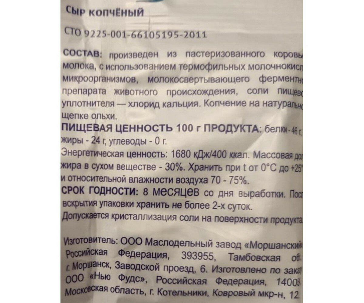 | Состав | Произведен из пастеризованного коровьего молока, с использованием мезофильных молочнокислых микроорганизмов, молокосвертывающего ферментного препарата животного происхождения, поваренной пищевой соли, уплотнителя – хлорид кальция |
