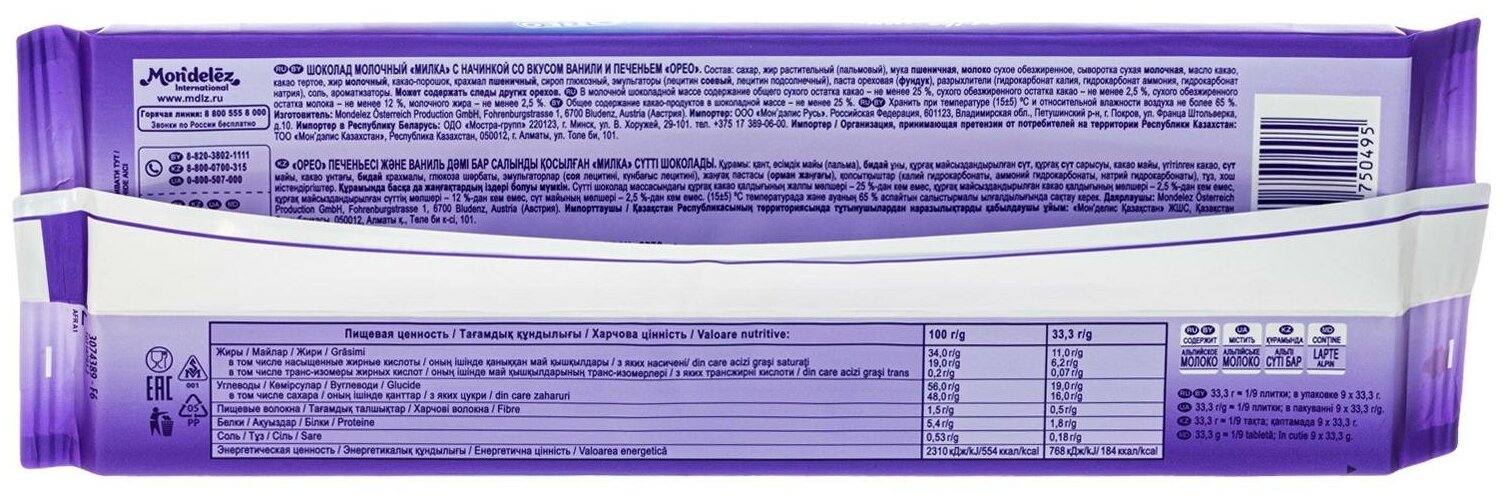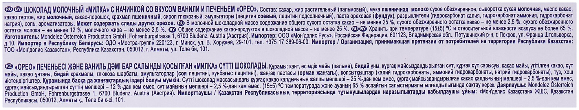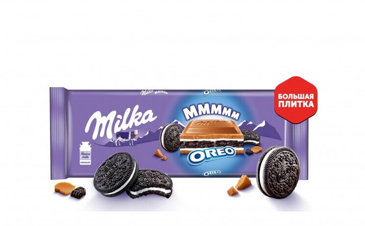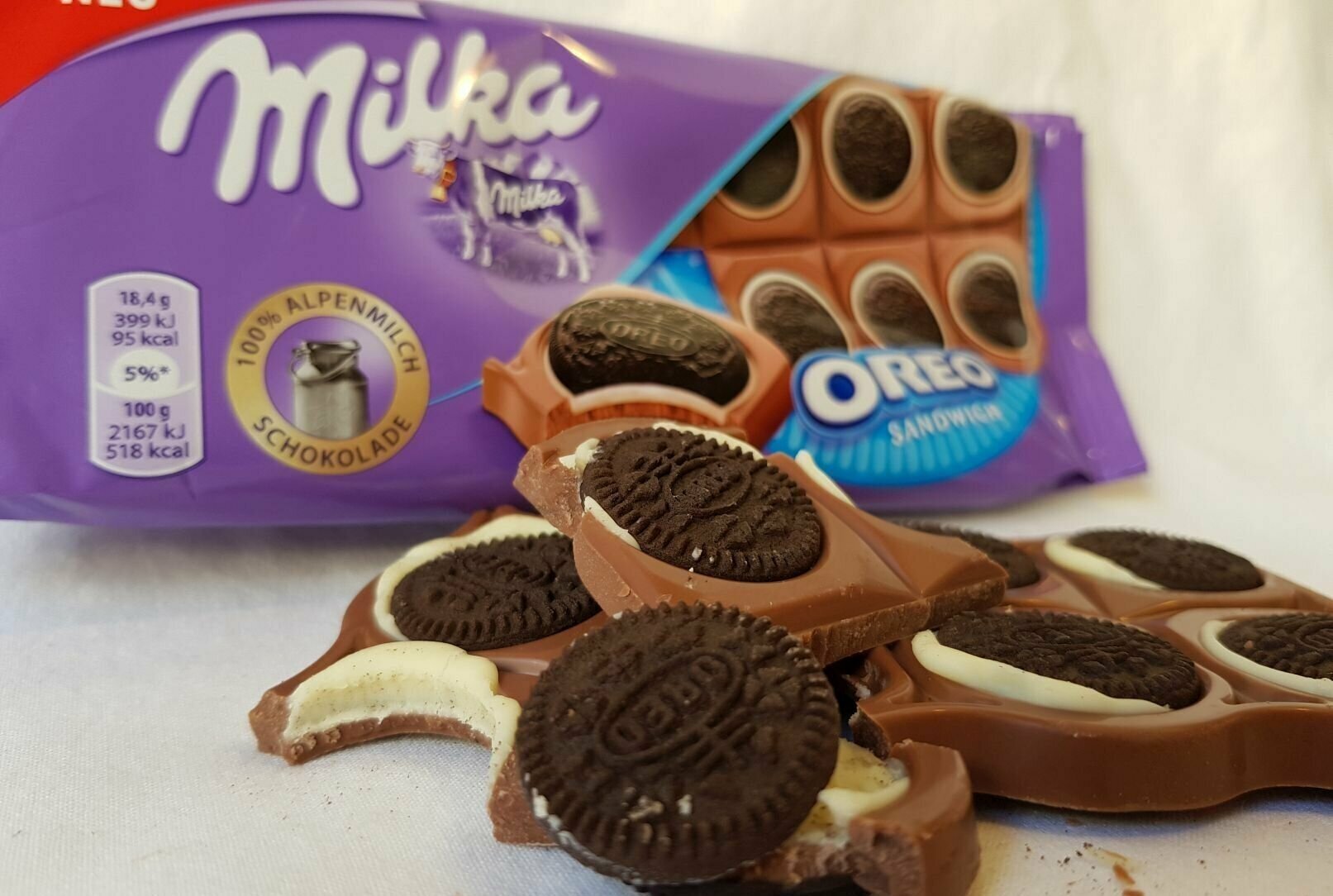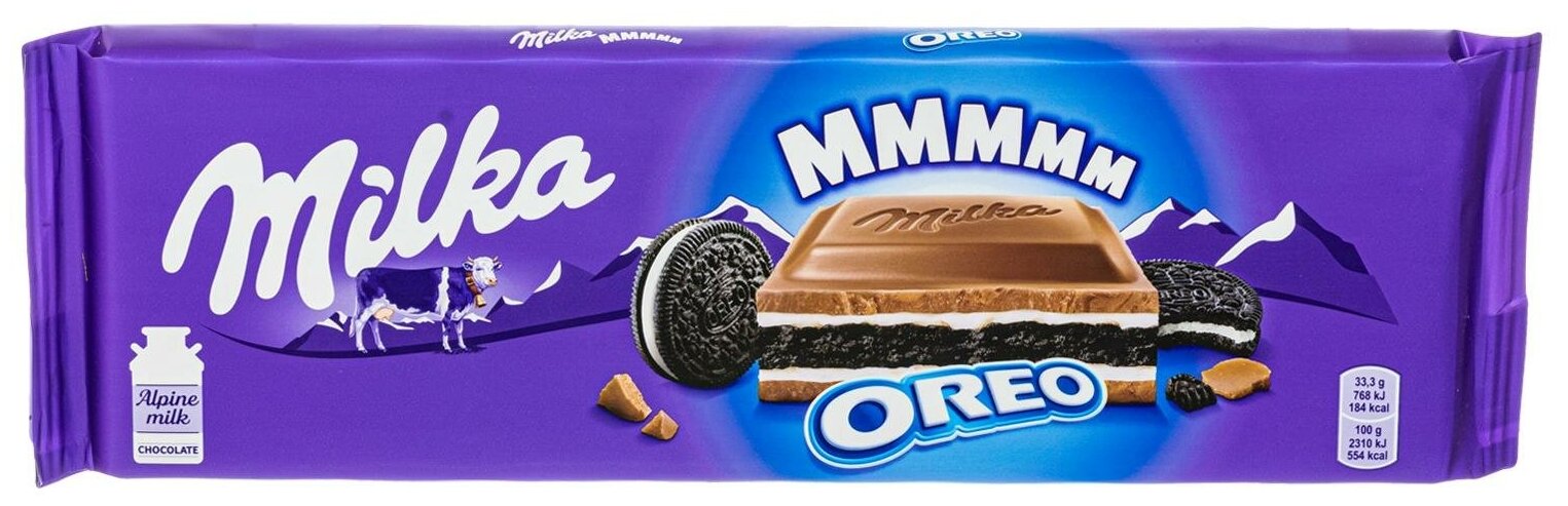 Шоколад Milka Oreo молочный с начинкой 300г - это шоколадное лакомство с печеньем, знаменитым на весь мир. Шоколадка приготовлена по уникальной рецептуре, разработанной швейцарскими шоколатье, на основе альпийского молока и высококачественных какао-бобов. Плитка представляет собой два тонких слоя нежнейшего молочного шоколада, два слоя ароматного ванильного крема и щедрый слой печенья Орео посередине. Упакована в обертку, которую можно многократно открывать и закрывать. Свое название известный швейцарский бренд получил от слов Milch (молоко) и Kakao (какао) - двух главных ингредиентов каждой шоколадки в яркой лиловой обертке.