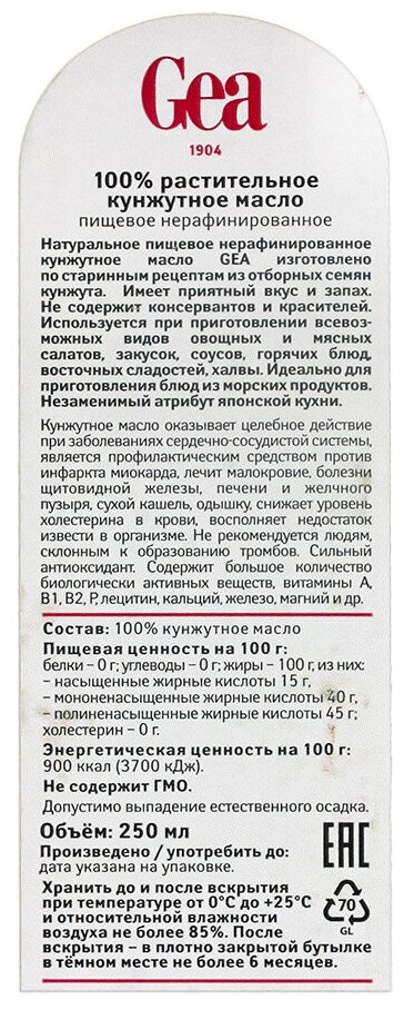 Масло кунжутное Gea 250мл производится на словенской маслобойне, расположенной в экологически чистом районе в окружении озер и Юлианских Альп. Масло натуральное, нерафинированное, готовится по старинному рецепту из отборных семян кунжута. У него приятный вкус и аромат, красивый янтарный цвет. Кунжутное масло содержит большое количество полиненасыщенных жирных кислот, витамины, микроэлементы. Регулярное употребление такого продукта оказывает благоприятное воздействие на работу сердечно-сосудистой системы, помогает при малокровии и заболеваниях щитовидной железы, восстанавливает работу печени и желчного пузыря, лечит сухой кашель, снижает уровень холестерина в крови. Является сильным антиоксидантом. Можно использовать для заправки салатов, приготовления холодных блюд. Подходит для термической обработки (в том числе барбекю и вок). Не содержит консервантов, красителей и ГМО.