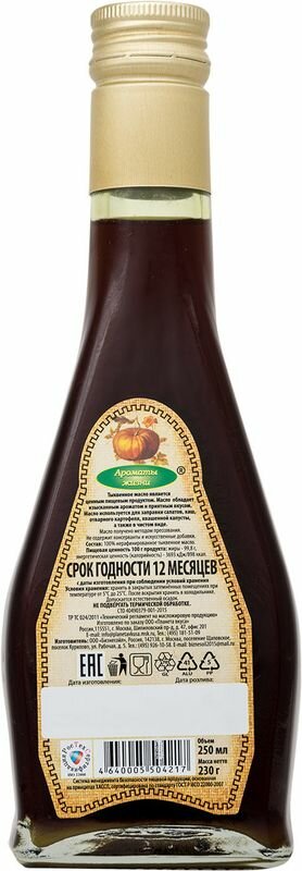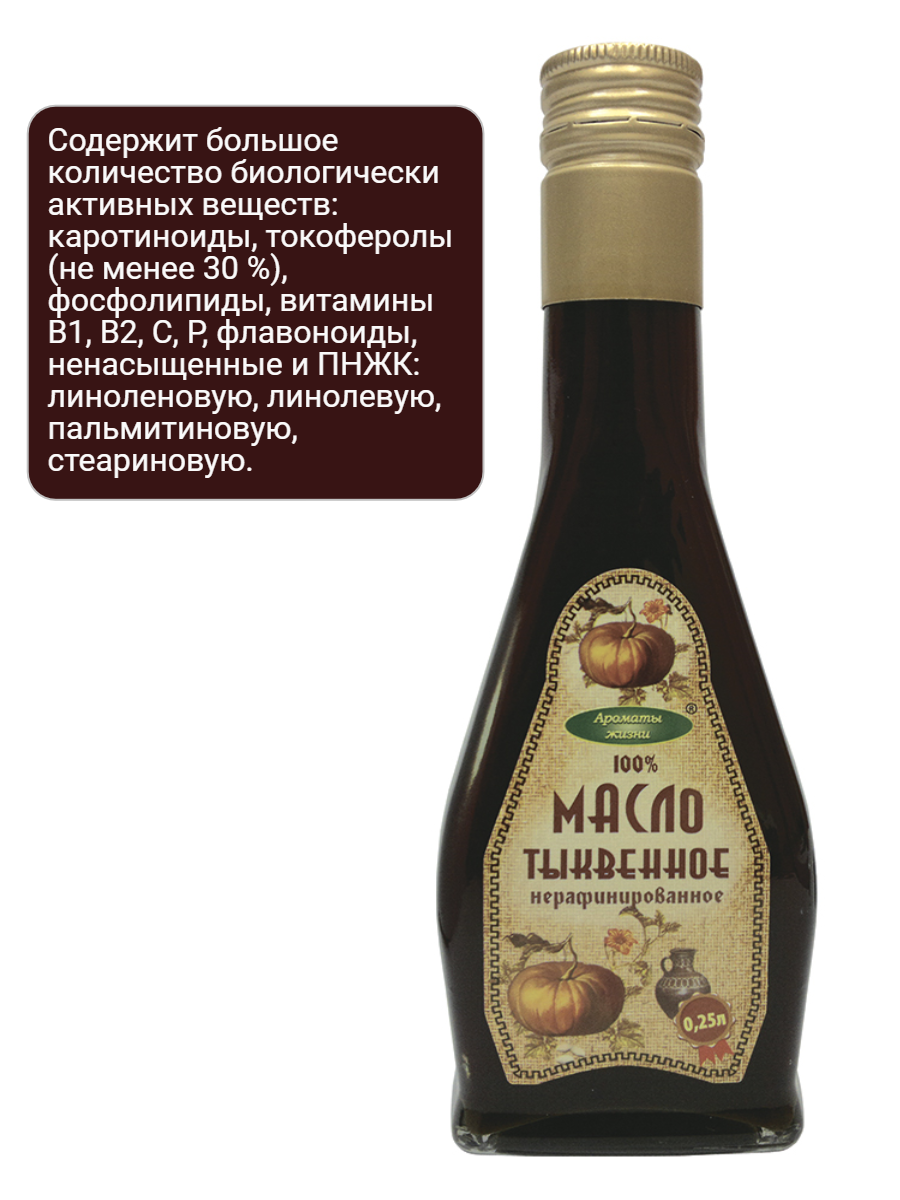 Масло тыквенное Ароматы жизни нерафинированное 250мл - 100% натуральный продукт без консервантов и искусственных добавок, полученный из семян тыквы путем холодного прессования. Масло имеет приятный вкус, темный зеленовато-коричневый цвет и тонкий ореховый аромат. В нем содержится большое количество биологически активных веществ, витаминов, минералов, ценных полиненасыщенных жирных кислот. Рекомендуется употреблять в холодном виде и не подвергать термической обработке. Идеально подходит для заправки каш и салатов, вареных и печеных овощей.