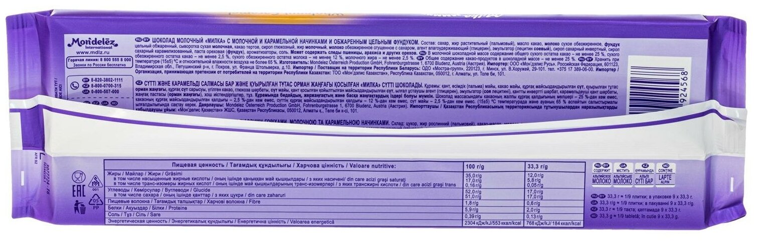 | Состав | Сахар, жир растительный (пальмовый), масло какао, молоко сухое обезжиренное, фундук цельный обжаренный, сыворотка сухая молочная, какао тертое, сироп глюкозный, жир молочный, молоко обезжиренное сгущенное с сахаром, агент влагоудерживающий (глицерин) , эмульгатор (лецитин соевый), сироп сахарный инвертный, сироп сахарный карамелизованный, паста ореховая (фундук), ароматизаторы, соль |
