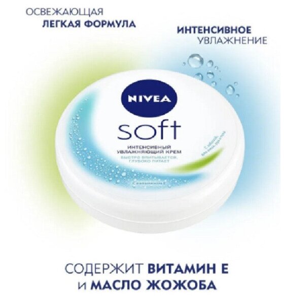 Так приятно, когда находишь средство, идеально подходящее не только для кожи рук, но и для тела и лица! Попробуйте наш универсальный увлажняющий крем NIVEA SOFT - высокоэффективный интенсивный увлажняющий крем для ежедневного использования. Легкая формула с витамином Е и маслом жожоба быстро впитывается, делая кожу невероятно мягкой и гладкой, и освежает кожу. Наслаждайтесь бодрящим ощущением мягкой и эластичной кожи. Легкий ненавязчивый аромат подойдет для всех членов семьи.