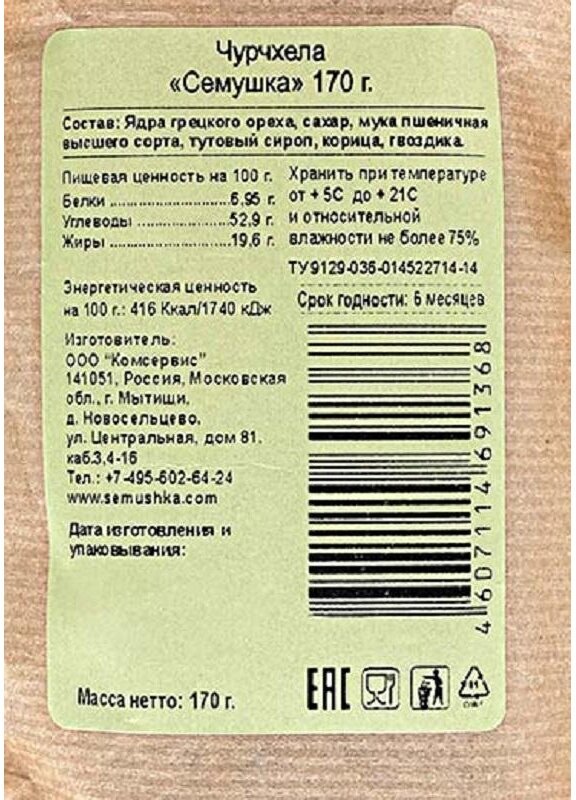 Сервис сравнения цен СкидкаГИД предлагает сравнить цены на товар «Чурчхела Семушка с грецким орехом в тутовом сиропе 170г Комсервис»