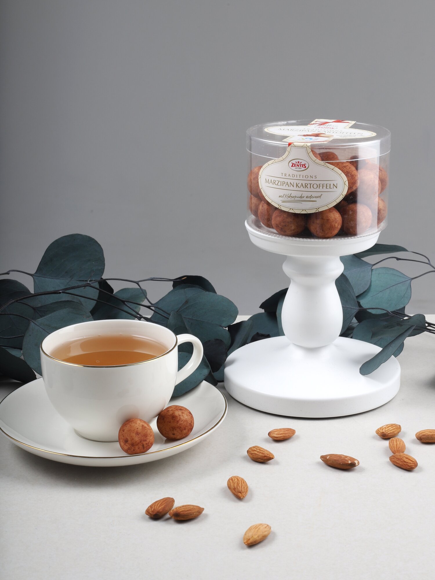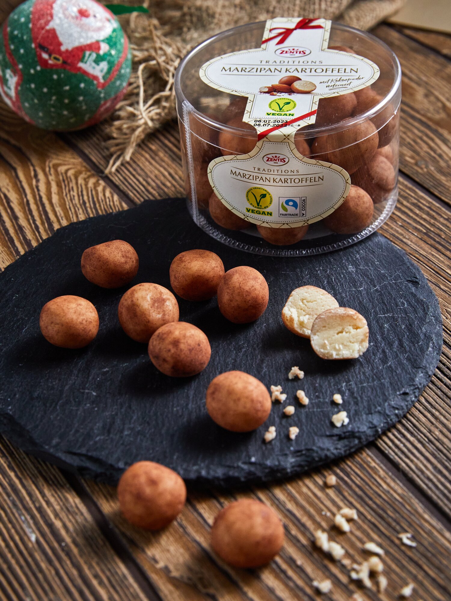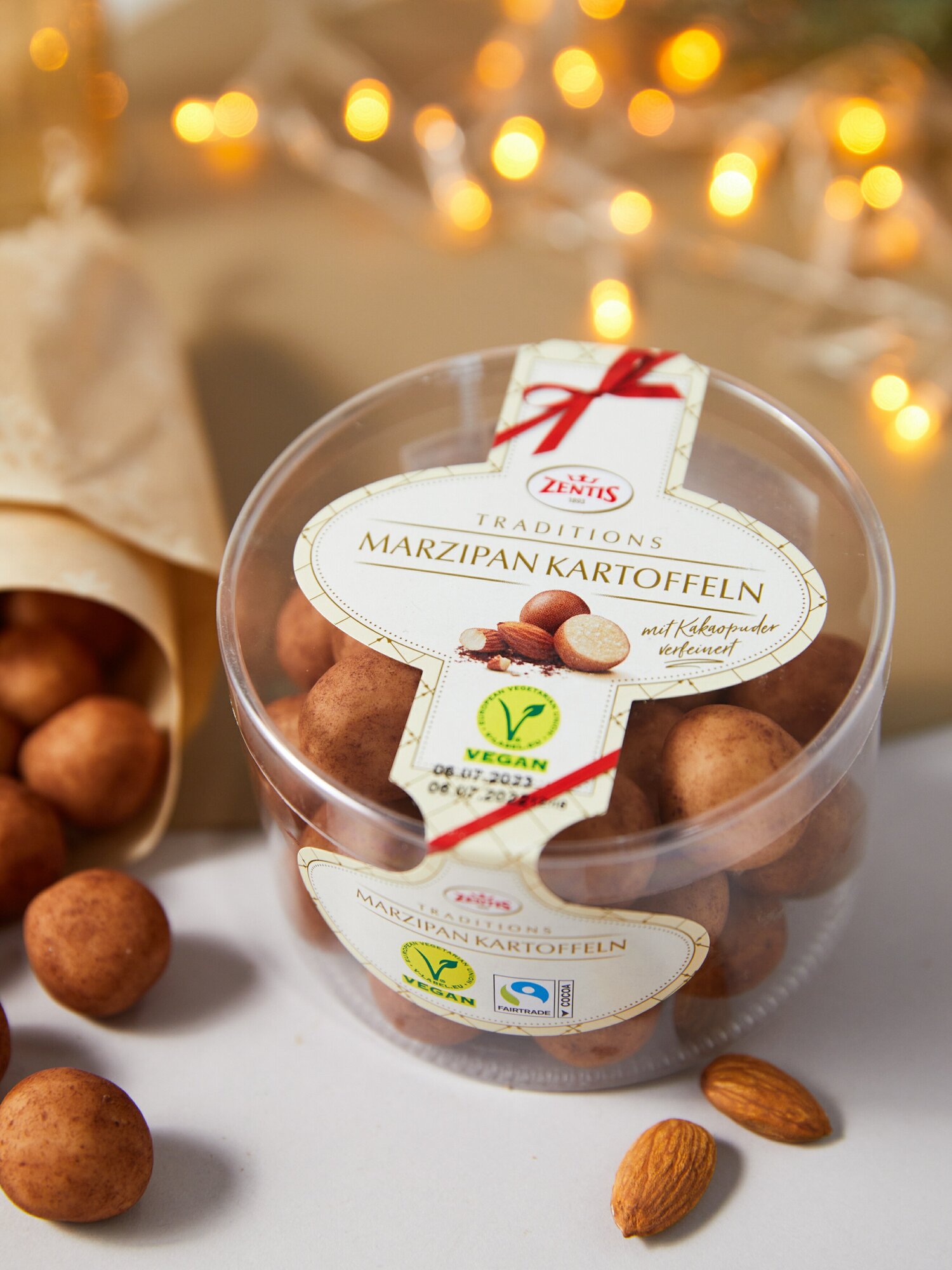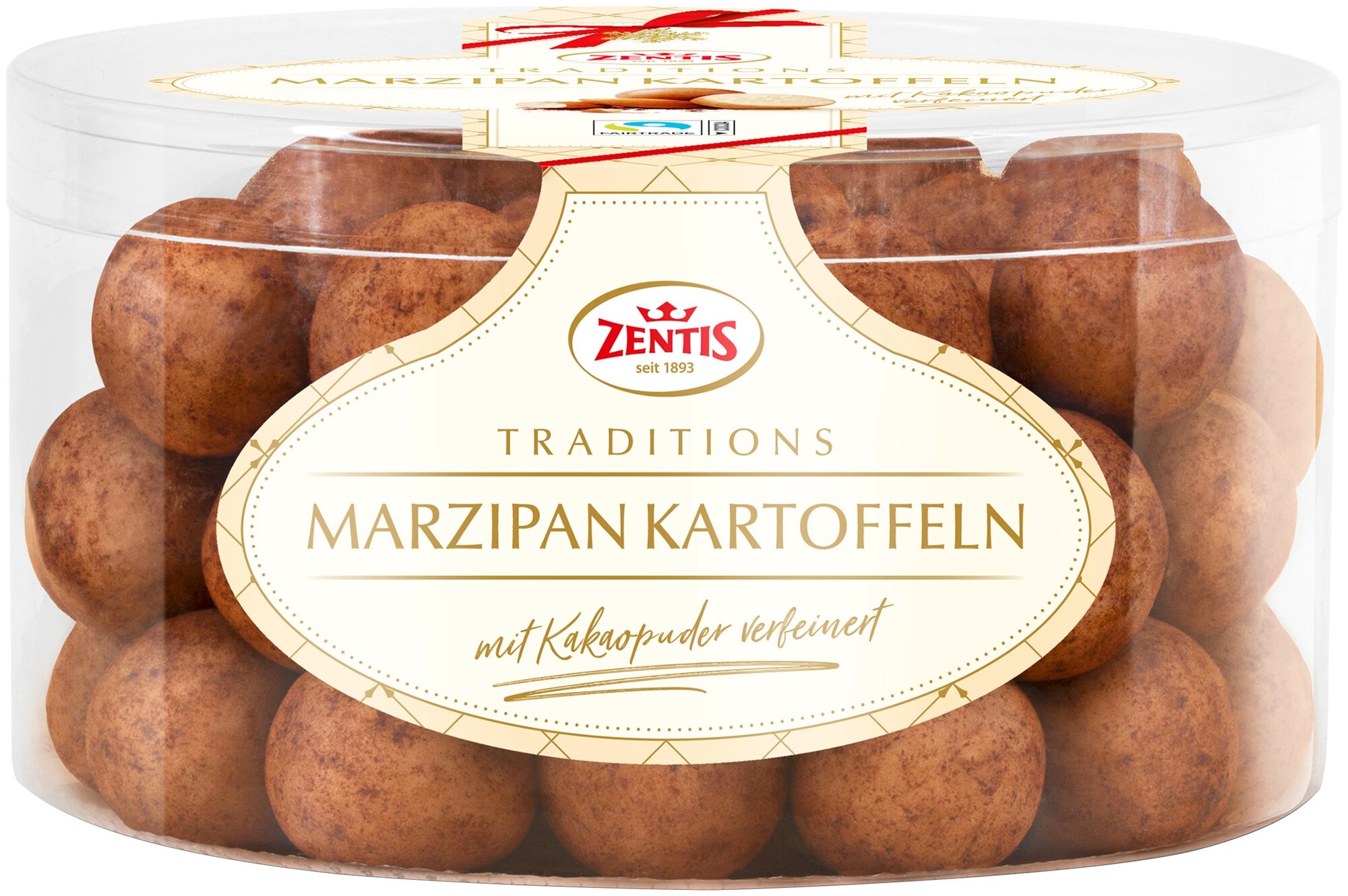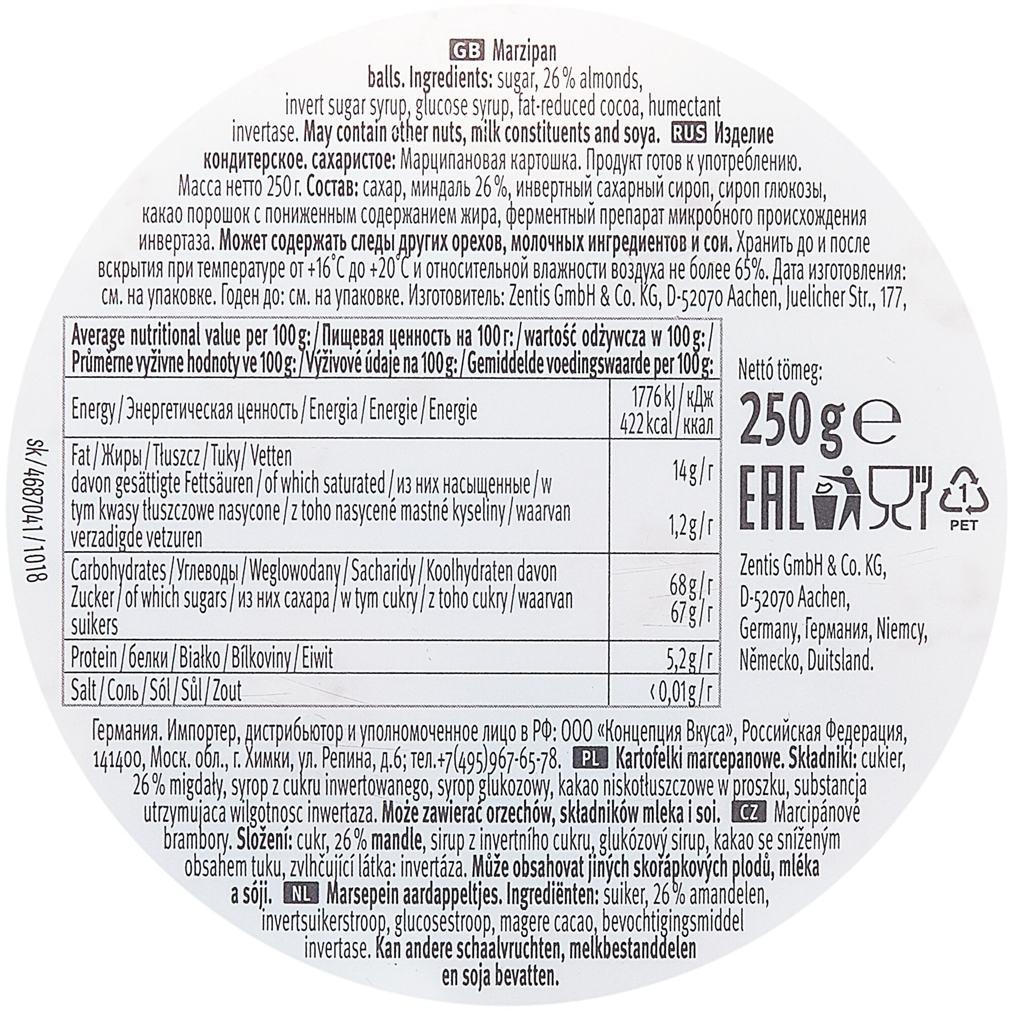 Картошка марципановая Zentis 250г - это традиционное европейское лакомство, приготовленное из отборного миндаля и сахарной пудры. Оно сформовано в виде миниатюрных клубней картофеля и припудрено сверху небольшим количеством темного какао-порошка. Марципан 50/50 имеет плотную, но мягкую консистенцию, насыщенный миндальный аромат и чистый ореховый вкус. Цельные орехи проходят минимальную переработку, поэтому марципановые продукты сохраняют всю пользу натурального миндаля и считаются одними из самых полезных десертов или сладостей к чаю.