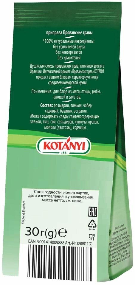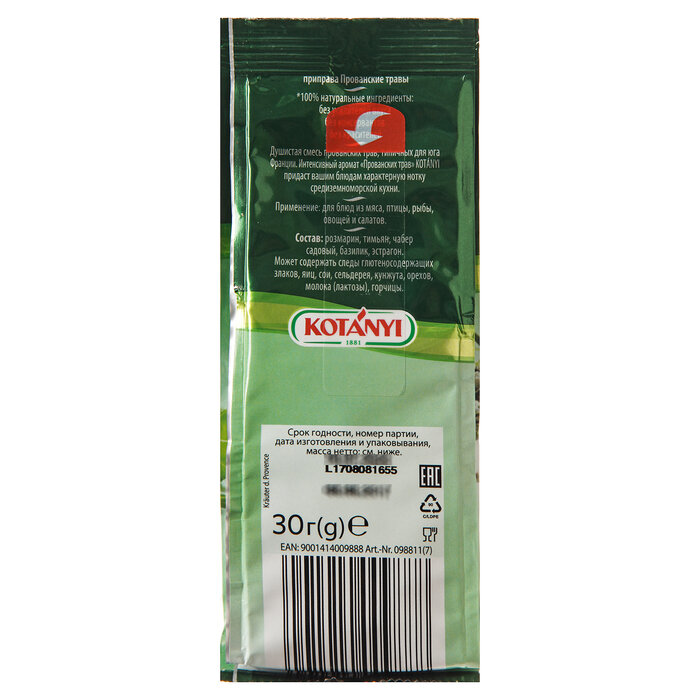 Описание товара:Душистая смесь прованских трав, типичных для юга Франции. Интенсивный аромат «Прованских трав» KOTÁNYI придаст вашим блюдам характерную нотку средиземноморской кухни.Состав товара:Розмарин, тимьян, чабер садовый, базилик, эстрагон.Меры предосторожности:Хранить плотно закрытым в сухом месте.