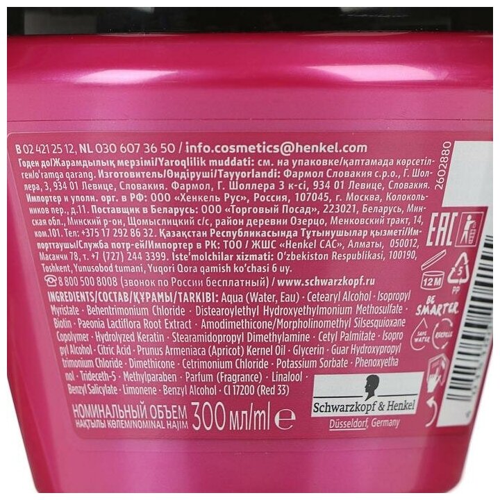 | Химический состав | Aqua, Cetearyl Alcohol, Isopropyl Myristate, Behentrimonium Chloride, Distearoylethyl Hydroxyethylmonium Methosulfate, Paeonia Lactiflora Root Extract, Amodimethicone/Morpholinomethyl Silsesquioxane Copolymer, Tocopheryl Acetate, Panthenol, Hydrolyzed Keratin, Prunus Armeniaca Kernel Oil, Stearamidopropyl Di methylamine, Cetyl Palmitate, Dimethicone, Phenoxyethanol, Citric Acid, Isopropyl Alcohol, Methylparaben, Parfum, Cetrimonium Chloride, Glycerin, Guar Hydroxypro pyltrimonium Chloride, Linalool, Benzyl Salicylate, Limonene, Trideceth-5, CI 17200 |