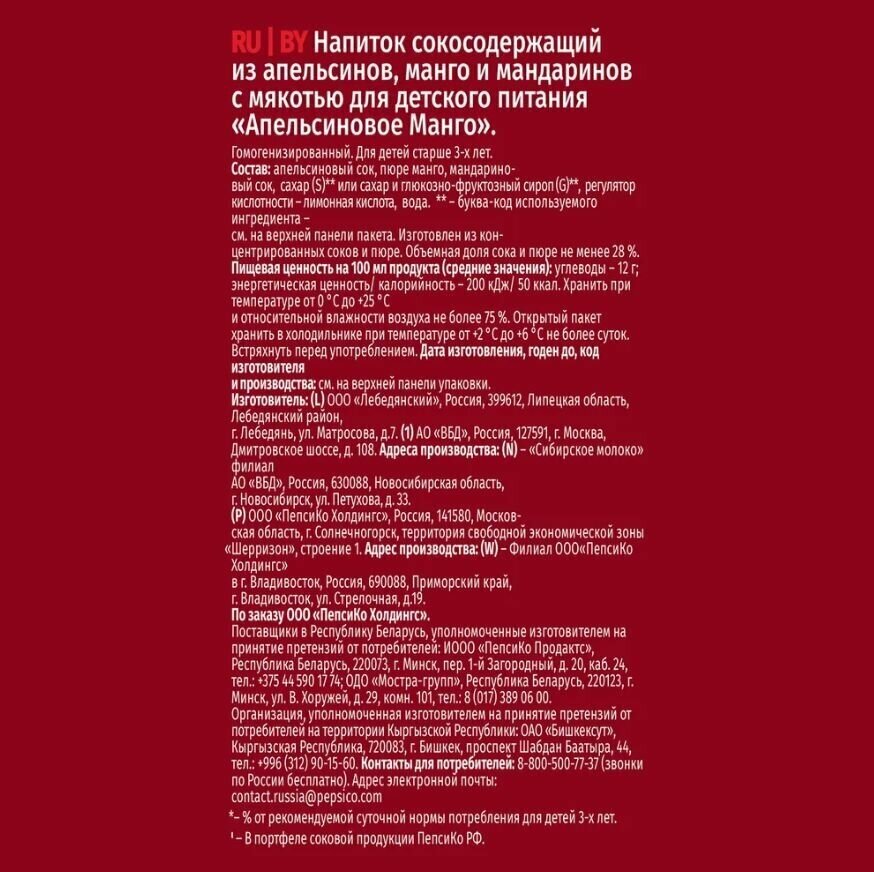 | Состав | Апельсиновый сок, пюре манго, мандариновый сок, сахар или сахар и глюкозно-фруктозный сироп, регулятор кислотности - лимонная кислота, вода |