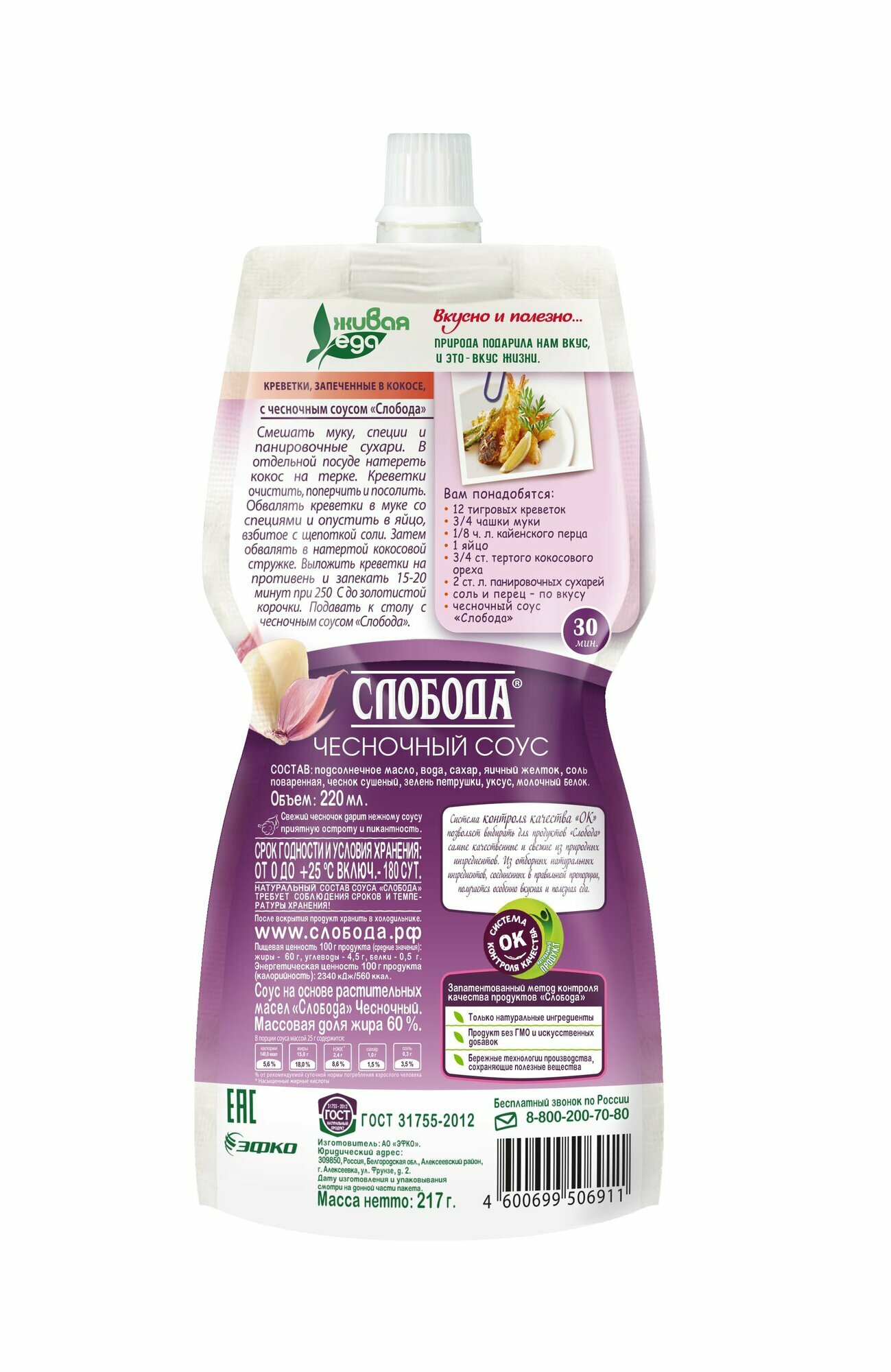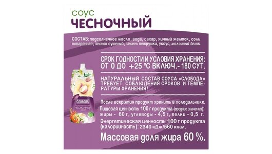 Описание товара:Приготовленный из натуральных ингредиентов с добавлением кусочков настоящего молодого чеснока, он обладает нежной сливочной консистенцией и гармоничным вкусом. Только натуральные ингредиенты. Без искусственных добавок. Не содержит ГМО. Без крахмала. Без консервантов. Без усилителей вкуса. Проверен “Органик-контроль”. Приготовлен по ГОСТ 31755-2012Состав товара:Подсолнечное масло, вода, сахар, яичный желток, соль поваренная, чеснок сушеный, зелень петрушки, уксус, молочный белок.Способ приготовления:Натуральный состав соуса "Слобода" требует соблюдения сроков и температуры хранения! После вскрытия упаковки продукт хранить в холодильнике.