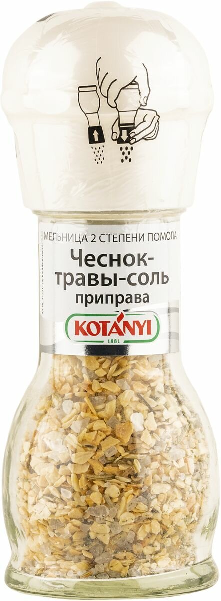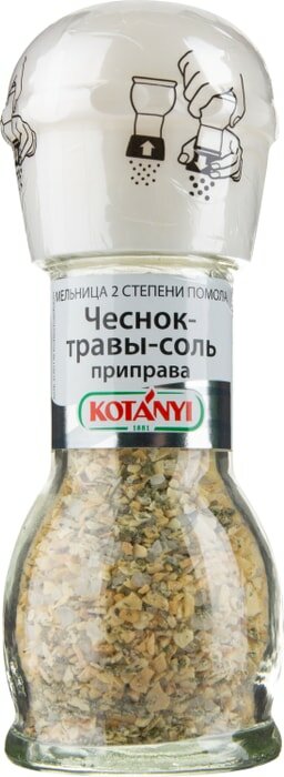 Приправа Kotanyi Чеснок-Травы-Соль 50г - это смесь крупной морской йодированной соли и пряных специй. В ее состав вошли ароматный сушеный чеснок, терпкий розмарин, душистый чабер, пикантные любисток и кервель, а также гороховые волокна. Эта универсальная приправа гармонично сочетается с мясом, птицей, овощами, супами, пиццей и даже горячими бутербродами. Удобная мельница позволит вам по достоинству оценить все преимущества свежемолотых специй. Пластиковый механизм на крышке имеет две степени помола. Чтобы выбрать крупный, переверните мельницу и опустите механизм до щелчка. Чтобы использовать мелкий помол, поднимите механизм по стрелочкам. Подходит для сервировки стола.