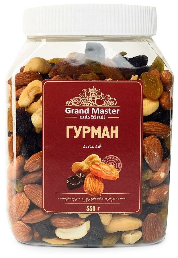 Смесь ореховая Grand Master Гурман 550г большая порция орехового лакомства для тех, кто ценит натуральный продукт! В составе смеси изюм и жаренные ядра кешью и миндаля. Миндаль богатый источник витамина E (токоферола), который служит очищению организма, избавляет его болезнетворной микрофлоры и токсинов, таких, например, как молочная кислота. Также в миндале содержится большое разнообразие витаминов группы B и различные минеральные соли. Кешью изысканный десертный орех с насыщенным вкусом и характерной мягкой структурой обогатит ваш организм необходимыми питательными веществами для укрепления сердечно-сосудистой и нервной систем. Несмотря на повышенную жирность, орешки кешью являются отличным продуктом для диетического питания, потому что отлично утоляют голод. Ягодки изюма придают смеси яркий вкус и аромат. Смесь от бренда Grand Master это отборные орехи, которые не только станут великолепной закуской, но и отлично поддержат ваше настроение и иммунитет!