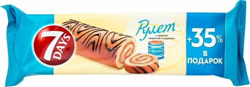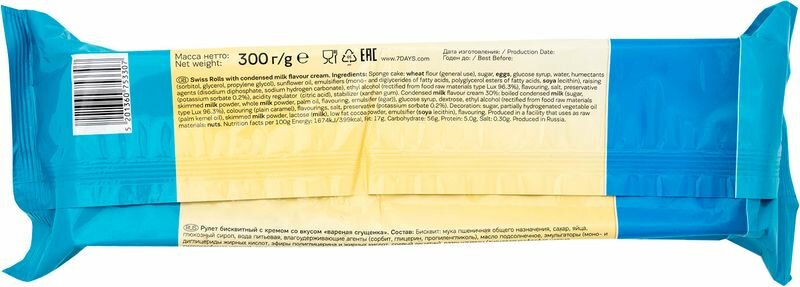 Описание товара:Нежный классический бисквит с традиционной, всеми любимой с детства, начинкой «варёная сгущёнка». Нежные бисквитные рулеты с широким ассортиментом начинок. Идеально подходят для семейного застолья. Для ваших друзей и родных в доме всегда надет угощенье – предложите им восхитительные бисквитные рулеты 7DAYS.Состав товара:Бисквит: мука пшеничная общего назначения, сахар, глюкозный сироп, инвертный сахарный сироп (сахар, вода питьевая, соль, регулятор кислотности кислота лимонная), влагоудерживающие агенты (сорбит, глицерин, пропиленгликоль), вода питьевая, масло растительное (масло подсолнечное), яичные продукты, эмульгаторы (моно- и диглицериды жирных кислот, эфиры полиглицерина и жирных кислот, лецитин подсолнечный), разрыхлители (дигидропирофосфат натрия, гидрокарбонат натрия), спирт этиловый ректификованный из пищевого сырья "Люкс" крепость 96.3% об., соль, ароматизатор, регулятор кислотности кислота лимонная, стабилизатор (ксантановая камедь), консервант (сорбат калия ). Крем со вкусом «варёная сгущёнка» 23 %: масло растительное (пальмовое масло), продукт растительно-молокосодержащий сгущенный с сахаром 27 %(сахар, молоко сухое обезжиренное, сыворотка сухая молочная подсырная, заменитель молочного жира (пальмовое масло, подсолнечное масло), ароматизатор, стабилизатор (агар)), глюкозный сироп, декстроза, инвертный сахарный сироп (сахар, вода питьевая, соль, регулятор кислотности кислота лимонная), спирт этиловый ректификованный из пищевого сырья "Люкс" крепость 96.3% об., краситель (сахарный колер l простой), ароматизаторы, соль, консервант (сорбат калия). Кондитерская глазурь: сахар, гидрогенизированное растительное масло (пальмоядровое масло), молоко сухое обезжиренное, лактоза, обезжиренный какао-порошок, эмульгатор (лецитин подсолнечный), ароматизатор, консервант (сорбат калия). Продукт может содержать незначительное количество: арахиса, фундука. ТУ 10.72.12-001-50894965-2019.Меры предосторожности:Продукт может содержать незначительное количество: орехов, соевых продуктов. Хранить при температуре не ниже от 6° С до 18° С и относительной влажности воздуха 75%.