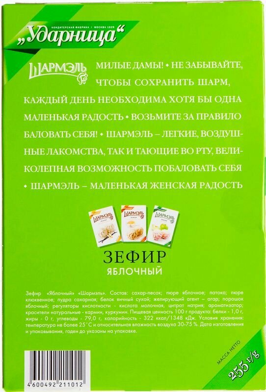 Зефир Шармэль Яблочный 255г - это изысканный легкий десерт от известной московской кондитерской фабрики "Ударница". В его основу легла разработанная более 50 лет назад рецептура из яблочного пюре, агара и яичного белка, в которую было добавленое клюквенное пюре (за счет чего цвет готового изделия получился нежно-розовым). Воздушная текстура, изумительный вкус и неприторная сладость стали визитной карточкой зефирной линейки производителя. Вся продукция делается исключительно из безглютенового сырья и не содержит ГМО.