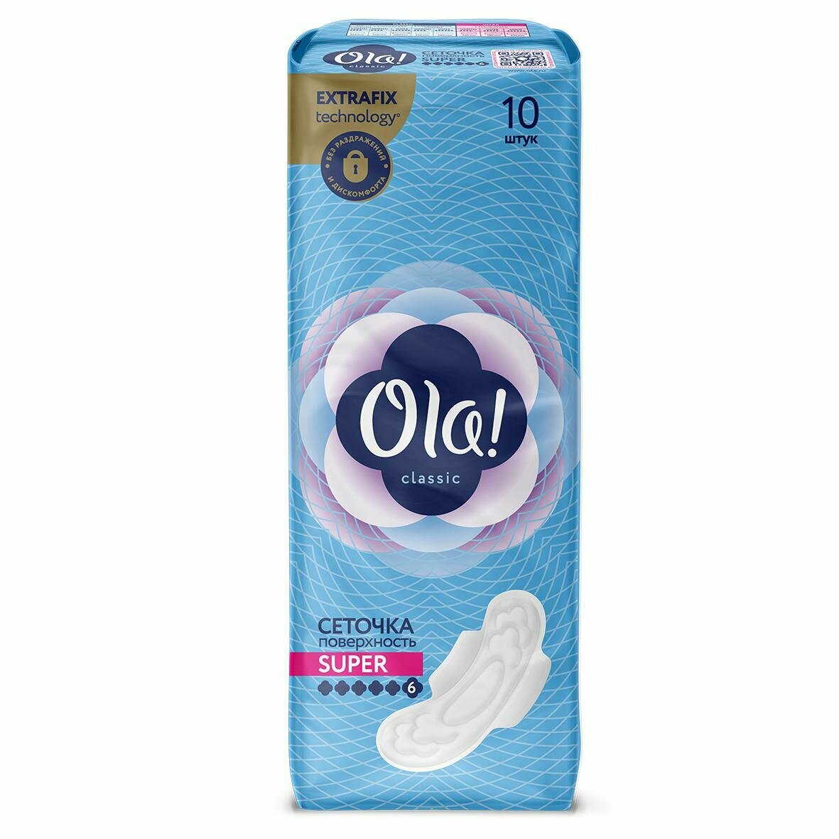 Прокладки Ola! Wings Super Top Dry 10шт предназначены для использования при обильных выделениях или ночью во время сна. Они имеют удлиненную заднюю часть и увеличенные крылышки для защиты от протеканий сзади и по бокам. Впитывающий слой расположен практически по всей площади изделия. Особая поверхность "сеточка" обеспечивает постоянную сухость и чистоту кожи. Влага, проникая под сеточку, остается внутри и не вытекает обратно. Увеличенная клейкая основа помогает надежно зафиксировать прокладку на белье.