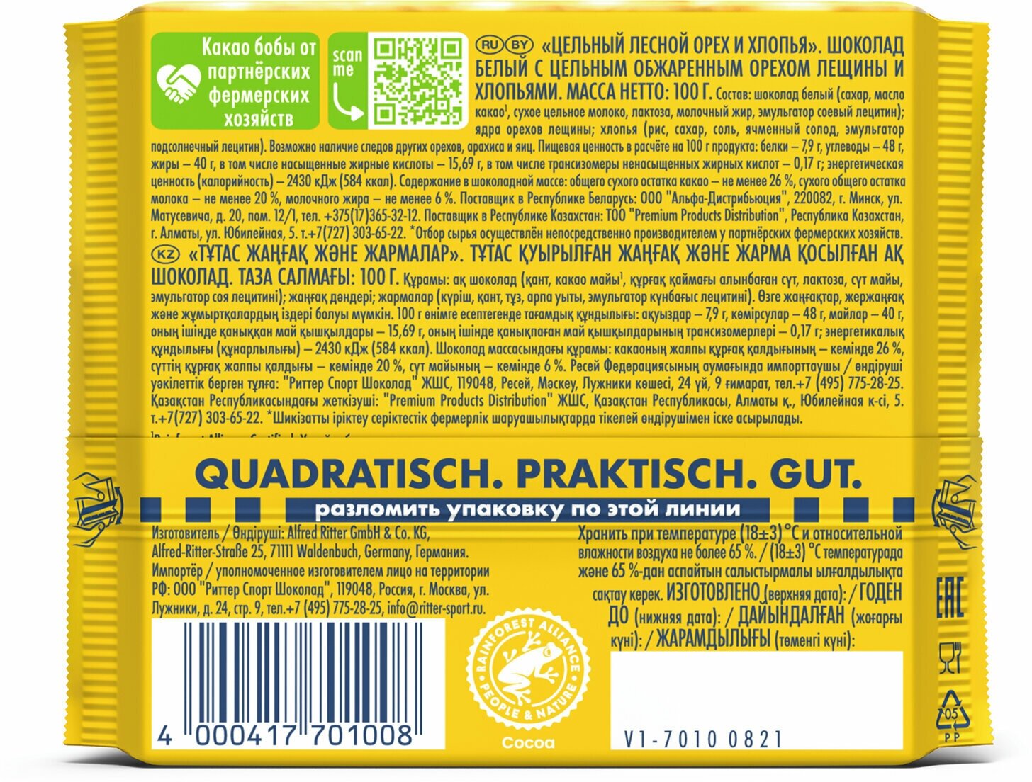 Шоколад Ritter Sport Белый Цельный лесной орех и хлопья 100г Alfred Ritter GmbH & Co.Kg