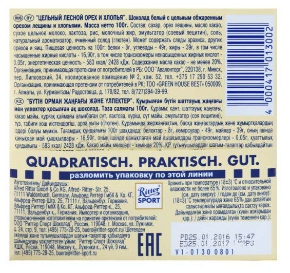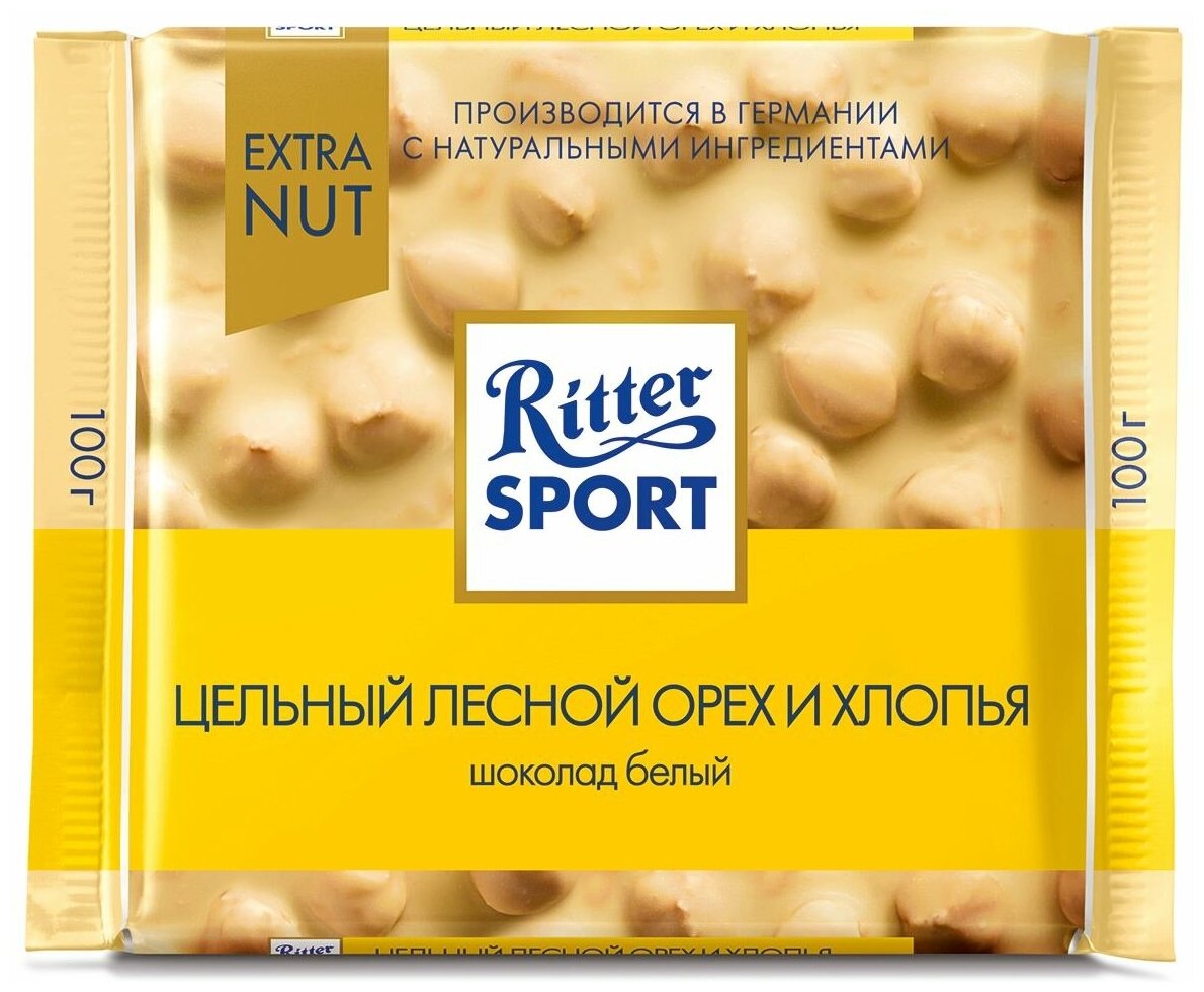 Шоколад Ritter Sport Белый Цельный лесной орех и хлопья 100г - это белый ванильный шоколад с большим количеством целых обжаренных лесных орехов и хрустящих рисовых хлопьев. Он выполнен в традиционной для бренда квадратной форме и разделен на 16 одинаковых квадратиков. Кстати, в таком виде шоколад начал выпускаться лишь в 1932 году, спустя 20 лет после основания семейной фабрики Риттер. Идея была в том, чтобы плитка помещалась в карман любой спортивной куртки, а весила столько же, сколько и обычная прямоугольная шоколадка. Позднее оригинальной стала не только форма, но и уникальная упаковка Knick-Pack, которая с легкостью вскрывается, когда вы надламываете плитку.