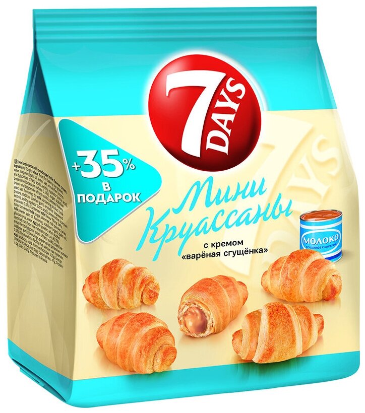 Мини-круассаны 7 Days с кремом Вареная сгущенка 300г - это миниатюрные кондитерские изделия буквально на пару укусов. Они приготовлены из слоеного дрожжевого теста и наполнены сладкой кремовой сгущенкой. Нежные, воздушные, легкие - они идеально сочетаются с любым напитком: утром с чашечкой кофе, в обеденный перерыв с кружкой бодрящего чая, в дороге или на прогулке с пакетиком сока или бутылочкой любимой газировки. После вскрытия упаковки рекомендуется переложить оставшиеся круассаны в полиэтиленовый пакет, чтобы они не засохли.