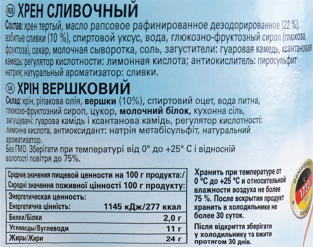| Состав | Хрен, рапсовое масло (22%), взбитые сливки (10%), спиртовой уксус, вода, глюкозно-фруктозный сироп, сахар, продукт сыворотки, соль, загустители: гуаровая камедь и ксантановая камедь, подкислитель: лимонная кислота, антиокислитель |