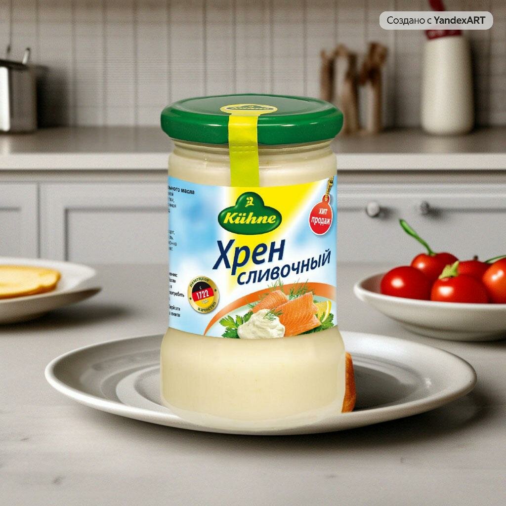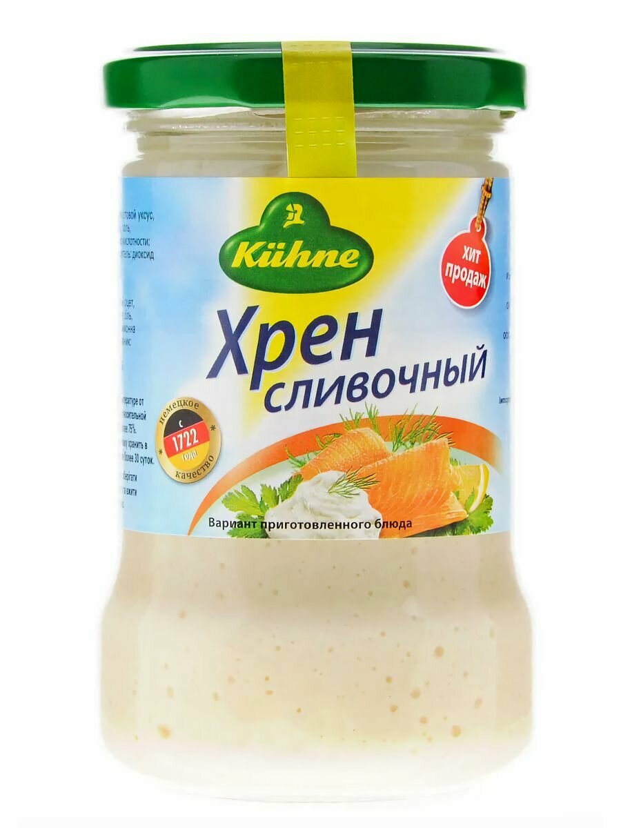 Хрен Kuhne Сливочный 250г - это умеренно острая приправа, созданная из мелко натертого свежего корня хрена и взбитых сливок. Имеет нежную кремовую консистенцию и деликатный сливочный вкус. Отлично дополняет любые блюда из мяса, птицы и рыбы, используется для приготовления маринадов, соусов и салатных заправок. Подается к холодцу и заливным. Продукт не содержит ГМО, глютен, усилители вкуса, подходит для вегетарианцев. Расфасован в стеклянную баночку с герметично закрученной крышкой.