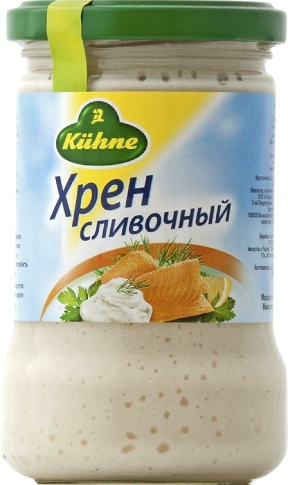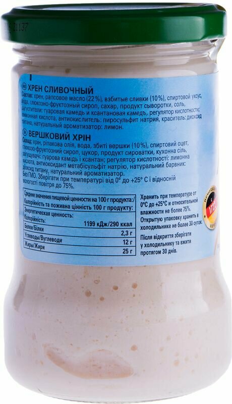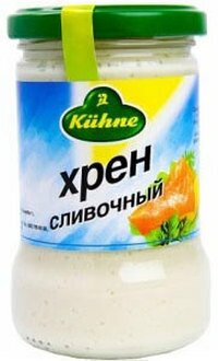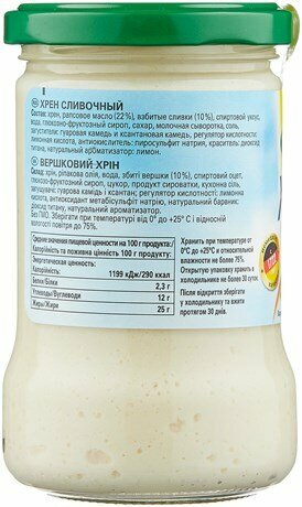 | Состав товара | Хрен, вода, рапсовое масло (22%), взбитые сливки (10%), спиртовой уксус, вода, глюкозно-фруктозный сироп, сахар, молочная сыворотка, соль, загустители |