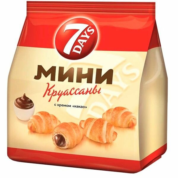 Мини-круассаны 7 Days с кремом Какао 105г - это миниатюрные кондитерские изделия буквально на пару укусов. Они приготовлены из слоеного дрожжевого теста и наполнены кремовой шоколадной начинкой. Нежные, воздушные, легкие - они идеально сочетаются с любым напитком: утром с чашечкой кофе, в обеденный перерыв с кружкой бодрящего чая, в дороге или на прогулке с пакетиком сока или бутылочкой любимой газировки. После вскрытия упаковки рекомендуется переложить оставшиеся круассаны в полиэтиленовый пакет, чтобы они не засохли.