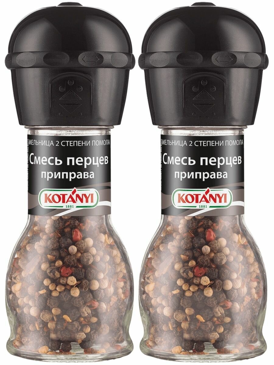Приправа Kotanyi Смесь перцев 35г - это пряная смесь четырех видов перца горошком (черного, белого, зеленого и розового) с кориандром, паприкой и жгучим чили. Это абсолютно универсальная приправа, которую можно использовать для приготовления соусов, салатов, первых блюд и горячего. С такой удобной мельницей вы сможете по достоинству оценить все преимущества свежесмолотых специй. Пластиковый механизм на крышке имеет две степени помола. Чтобы выбрать крупный, переверните мельницу и опустите механизм до щелчка. Чтобы использовать мелкий помол, поднимите механизм по стрелочкам. Подходит для сервировки стола.