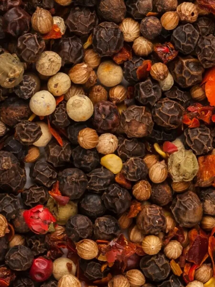 | Состав | (67%) перец (черный, белый, зеленый), кориандр, гранулы паприки, чили, розовые ягоды. |