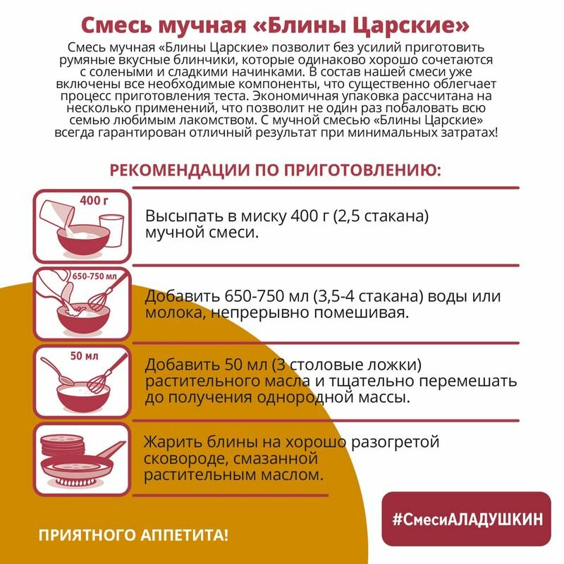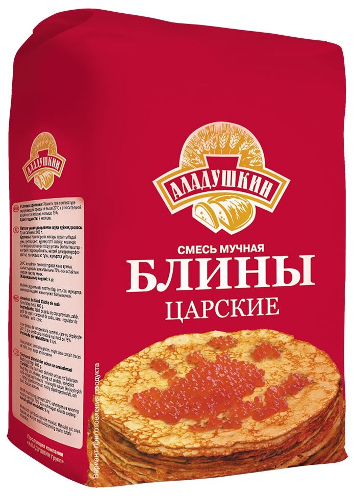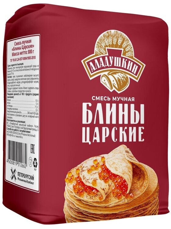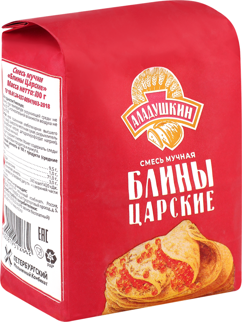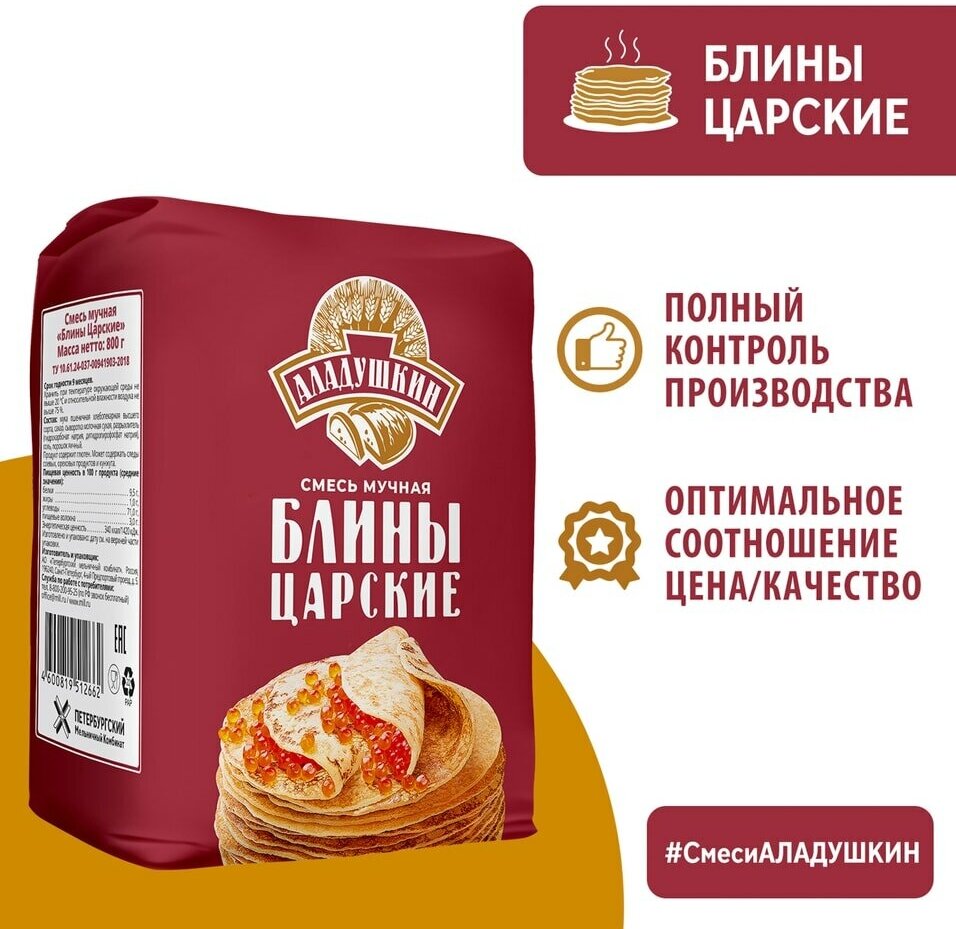 Сервис сравнения цен СкидкаГИД предлагает сравнить цены на товар «Смесь для выпечки мучная Аладушкин Блины Царские 800г Петербургский МК»