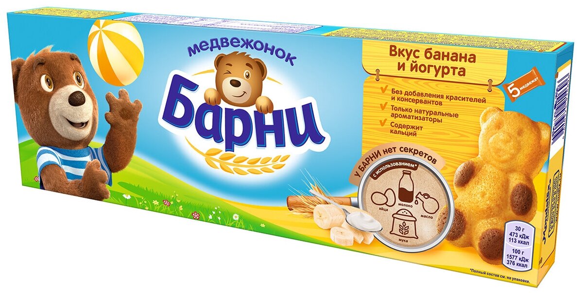 Пирожное Медвежонок Барни Банан и Йогурт 5шт*30г - это сочное бисквитное лакомство с нежной бананово-йогуртной начинкой, выпеченное в виде забавного маленького медвежонка. Оно приготовлено из натуральных ингредиентов, обогащено кальцием, необходимым для здорового роста и развития детей, не содержит красителей и консервантов. Это вкусный и питательный перекус, который отлично сочетается с соком, молоком, кефиром, чаем или какао. Каждое пирожное находится в индивидуальной упаковке, его удобно брать с собой в дорогу, давать ребенку в школу или на прогулку.