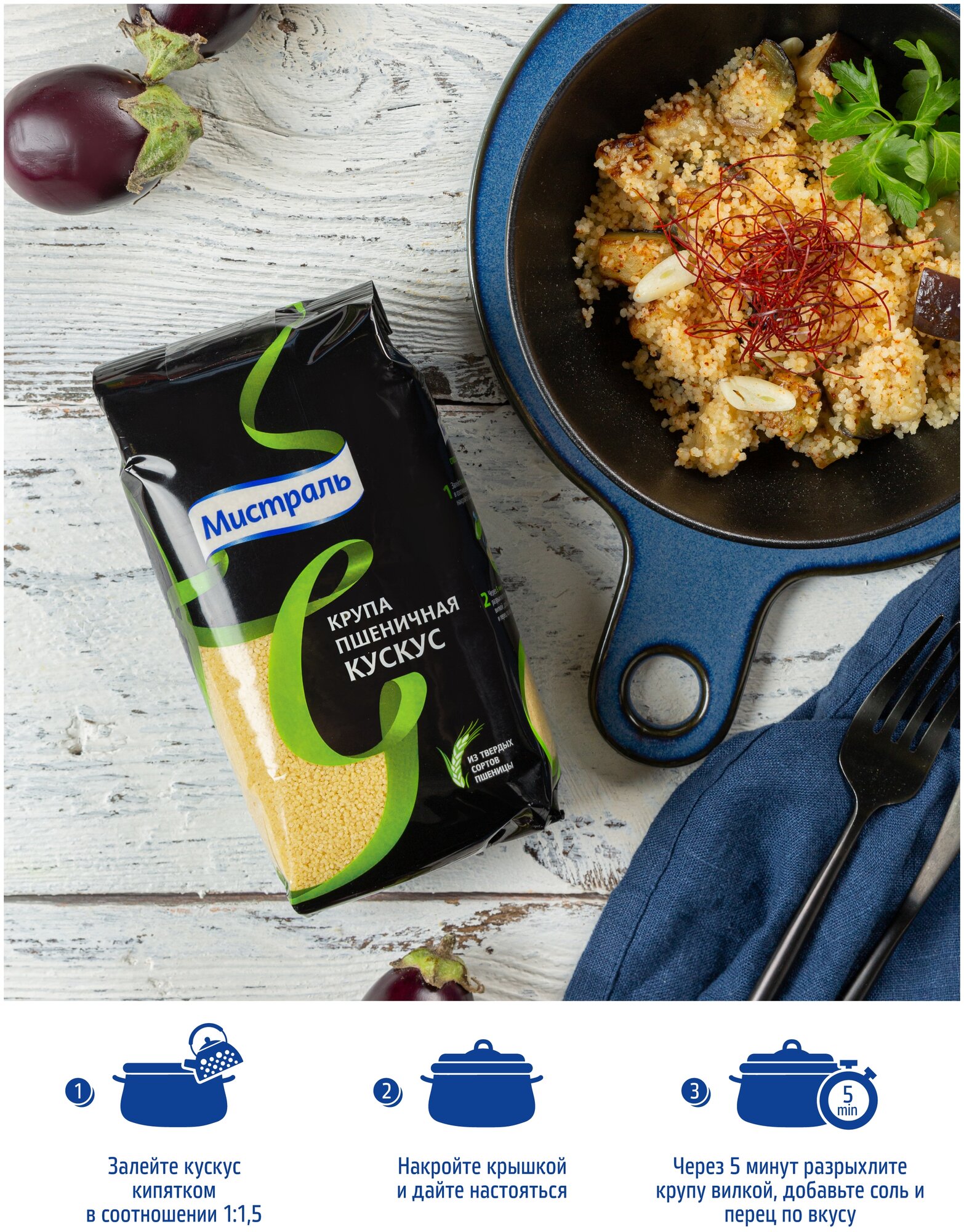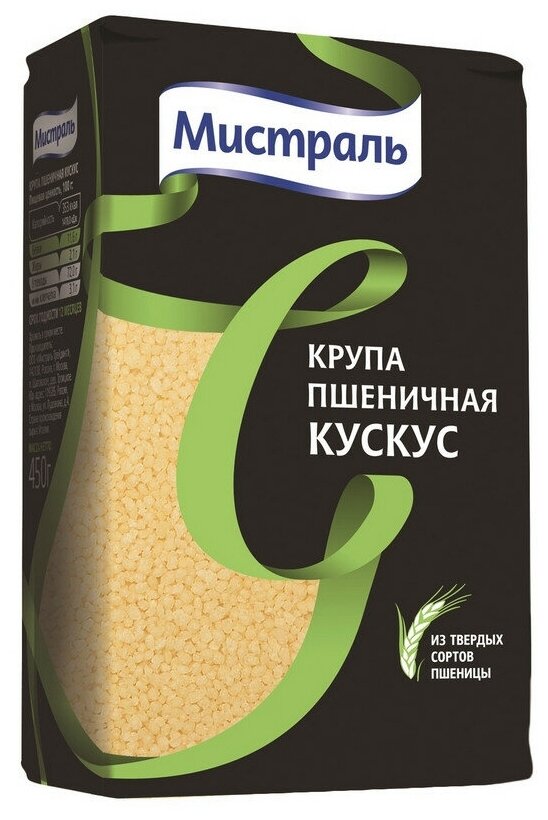 Кускус Мистраль 450г - это пшеничная крупа, которая пришла к нам из арабской кухни. Она производится из манки из твердых сортов пшеницы и формуется в крупинки диаметром 1-2мм. Варить кускус не требуется, достаточно залить его кипятком в пропорции 1:2. Спустя 5 минут взрыхлите готовую крупу вилкой, приправьте солью и перцем и подавайте. После термической обработки кускус становится аппетитно-желтым, рассыпчатым и сладковатым. Он быстро впитывает вкусы и ароматы других продуктов, поэтому его подают в качестве гарнира к мясу, птице, овощам, а также блюдам в соусе или с подливой.