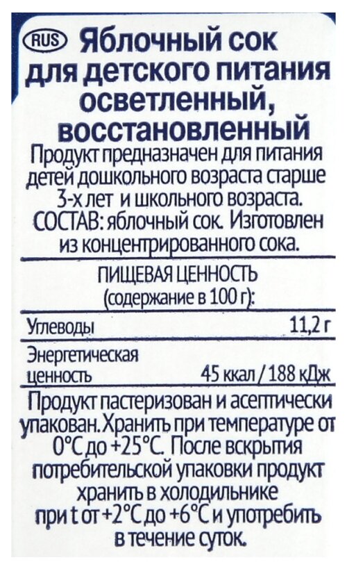 Сок яблочный для детского питания. Рекомендовано для употребления с 3-х лет в организованных детских учреждениях.