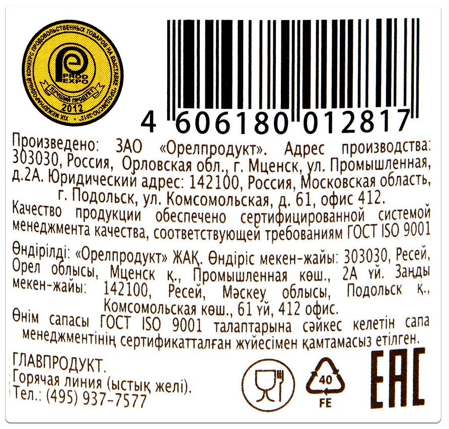 | Изготовитель | АО "Орёлпродукт", Россия |