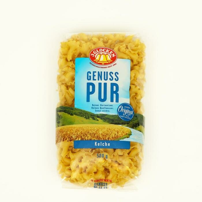 Макароны 3 Glocken Genuss Pur Клецки 500г - это оригинальные макаронные изделия, похожие на небольшие чашечки с волнистым краем. Благодаря особой форме с углублением, такие макароны забирают в себя много соуса, поэтому их можно подавать не только как гарнир, но и как основное блюдо с мясным или сливочным соусом. Продукция немецкой торговой марки 3 Glocken производится из золотистой пшеницы твердых сортов, чистой родниковой воды из района Оденвальд и отборных яиц от кур свободного выгула (в этом виде пасты яиц нет). Рекомендуется варить в подсоленной воде примерно 7-8 минут.