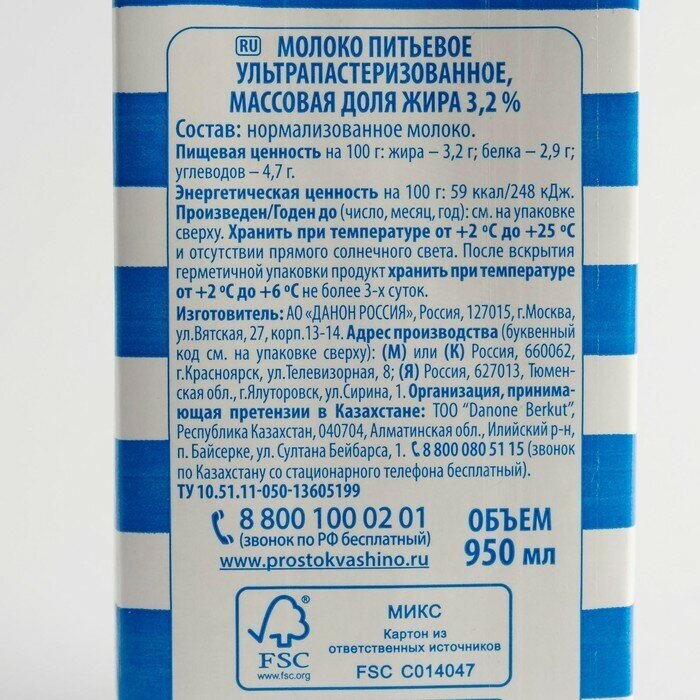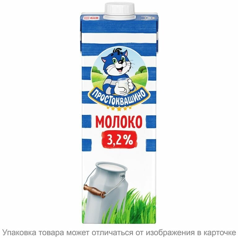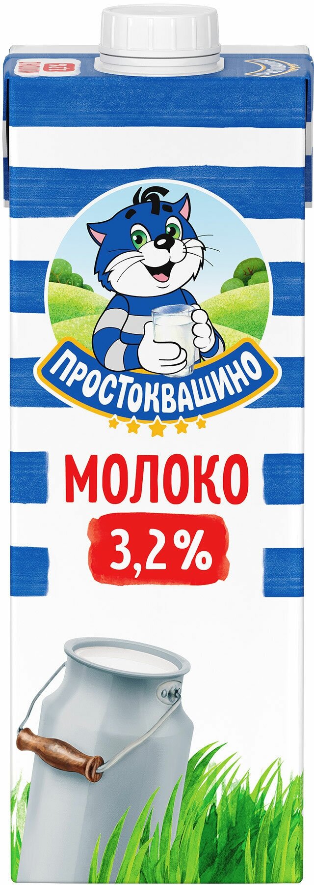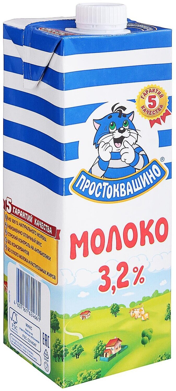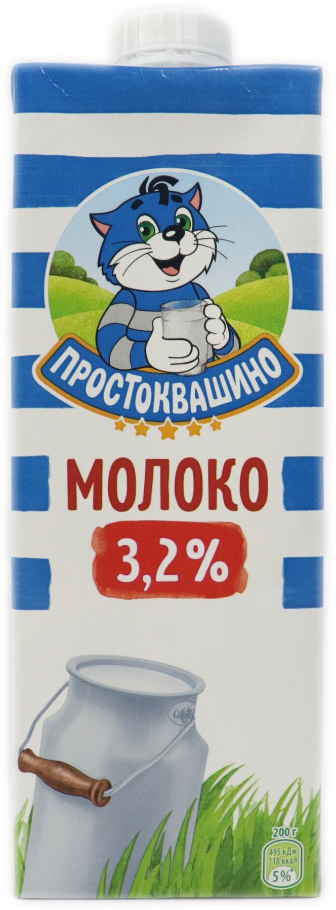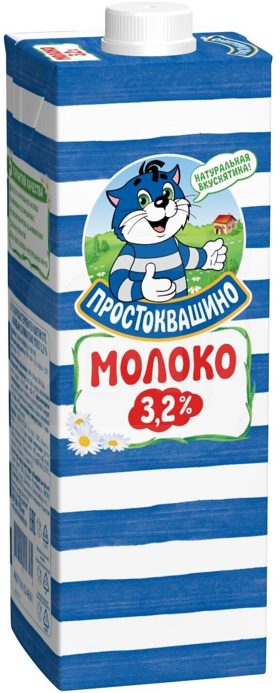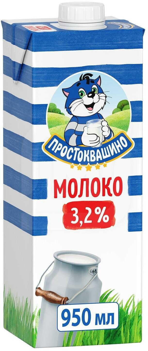 Молоко Простоквашино ультрапастеризованное 3.2% 950мл производится из нормализованного молока. Ультрапастеризация, особый способ переработки, позволяет убить вредные микробы, но при этом сохранить все полезные свойства свежего коровьего молока, его вкус и пищевую ценность. Такой напиток - хороший источник полноценного белка, витаминов группы B, аминокислот, кальция и фосфора. Вся продукция торговой марки имеет несколько гарантий качества: она готовится из 100% натурального молока с ближайших ферм, проверяется на наличие антибиотиков, не содержит консервантов и растительных жиров.