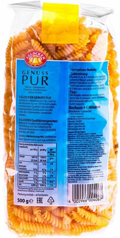 Макароны 3 Glocken Genuss Pur Спирали 500г - это традиционные макаронные изделия среднего размера, скрученные по спирали. Благодаря желобкам, такие макароны впитывают много соуса, поэтому их можно подавать не только как гарнир, но и как основное блюдо с мясным или сливочным соусом. Продукция немецкой торговой марки 3 Glocken производится из золотистой пшеницы твердых сортов, чистой родниковой воды из района Оденвальд и отборных яиц от кур свободного выгула (в этом виде пасты яиц нет). Рекомендуется варить в подсоленной воде примерно 4-5 минут.