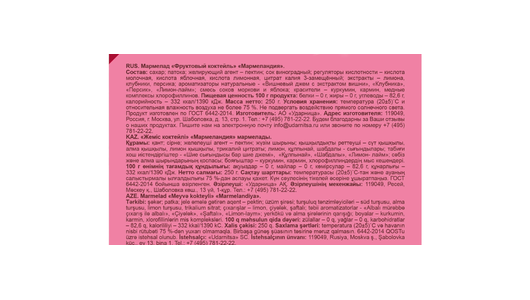 | Состав | сахар, патока, желирующий агент - пектин, сок виноградный, регуляторы кислотности - кислота молочная, кислота яблочная, кислота лимонная, цитрат натрия, экстракты - лимона, клубники, персика, ароматизатор с экстрактом вишни, ароматизаторы, красители натуральные - сок черной моркови, куркумин, кармин, хлорофиллин. |