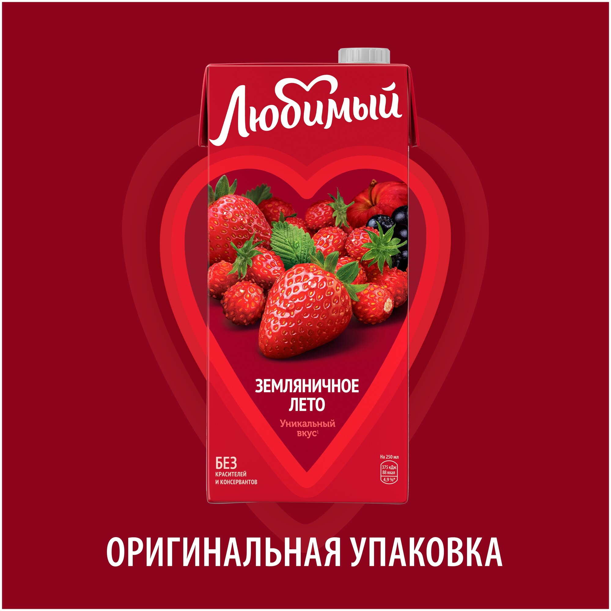 У вас со второй половинкой совершенно разные вкусы? «Любимый. Земляничное лето» придется по душе вам обоим. Почувствуйте вкус и аромат спелых ягод, согрейте друг друга теплом летних воспоминений и живите в гармонии! ●Без добавления красителей и консервантов. ●Вкус и аромат спелых ягод●Для всей семьи●«Любимый. Земляничное лето» придется по душе вам со второй половинкой, даже если у вас совершенно разные вкусы●Согрейте друг друга теплом летних воспоминений и живите в гармонии! «Любимый» – один из лидеров сокового рынка России. Портфель бренда представляют нектары и соковые напитки на любой вкус высокого качества и по доступной цене. В его широкой ассортиментной линейке – уникальные вкусовые сочетания, такие же гармоничные, как и союз любящей пары! Продукция бренда бережно сохраняет вкус и аромат сочных спелых фруктов и ягод без использования искусственных красителей и консервантов.